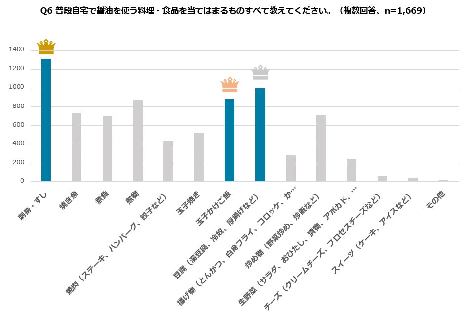 ◇Q6「普段自宅で醤油を使う料理・食品」として選択されたもの、1位:刺身・寿司(1,310人)、2位:豆腐(997人)、3位:玉子かけご飯(881人)という順となりました。