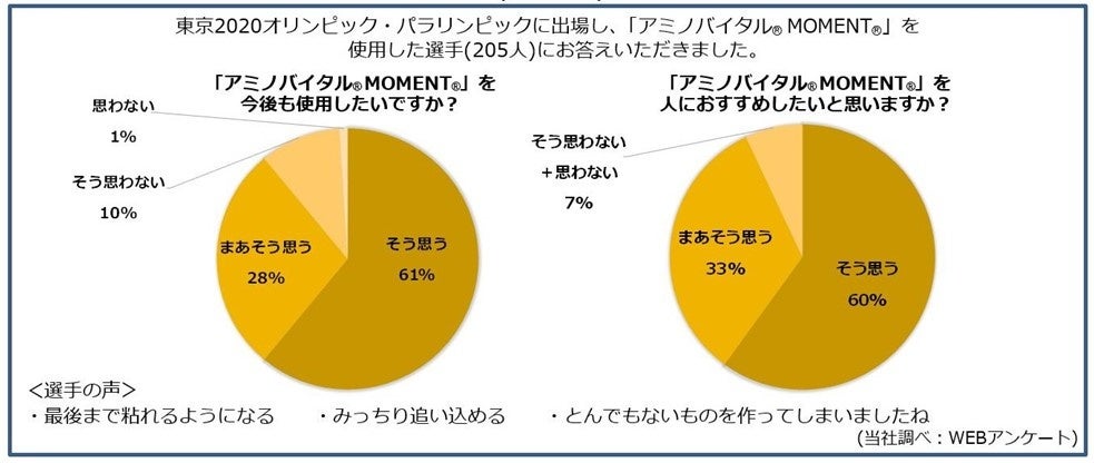 また、東京2020日本代表選手団向けに「アミノバイタル® 東京2020日本代表選手団SPECIAL MOMENT(モーメント)」(非売品)として開発・提供され、「TEAM JAPAN」としてパリ2024オリンピック・パラリンピックに出場が内定した選手へも提供を開始しているアミノ酸サプリメントを、「アミノバイタル® MOMENT®(モーメント)」として、パリ2024オリンピック開幕日の2024年7月26日(金)よりスポーツ量販店および通信販売にて販売開始します。スポーツ栄養科学研究に基づき開発された“瞬間”ブーストアミノ酸(アスパラギン酸3,100mg)を配合した、“持てるパワーを引き出す”サプリメントです。本サプリメントについては、東京2020オリンピック・パラリンピック出場にあたって使用した選手の内、約9割が今後も使用意向を示すなど高い評価を受けました(下図参照)。