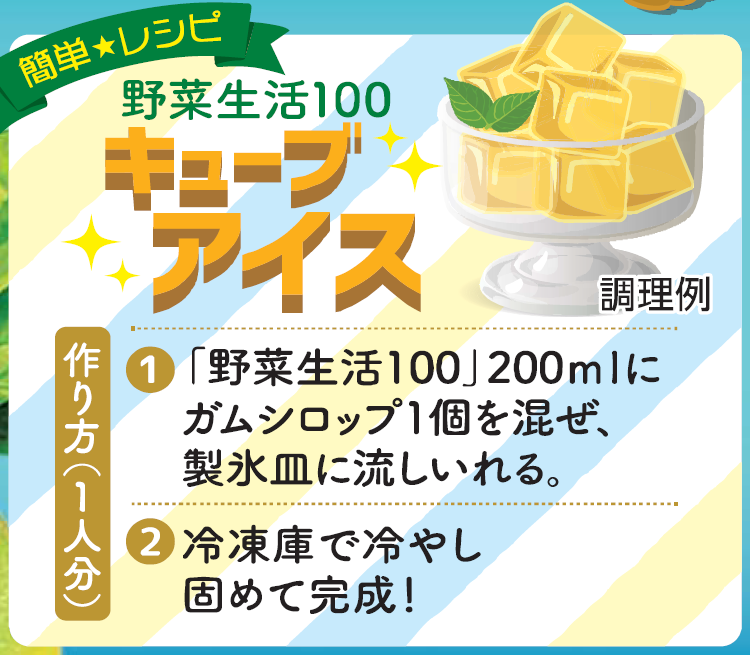 「野菜生活100 ゴールデンパイン&キウイミックス」は、ゴールデンパインの芳醇な甘さとキウイの甘酸っぱい味わいを活かした野菜・果実ミックスジュースです。1日分※のビタミンC(コップ1杯200mlあたり)とミネラル(カリウム)、クエン酸をおいしく摂ることができます。本品を使用した簡単アレンジで、ガムシロップを入れて冷凍庫で冷やし固める「キューブアイス」をおすすめしています。※ 栄養素等表示基準値(2015)に基づく