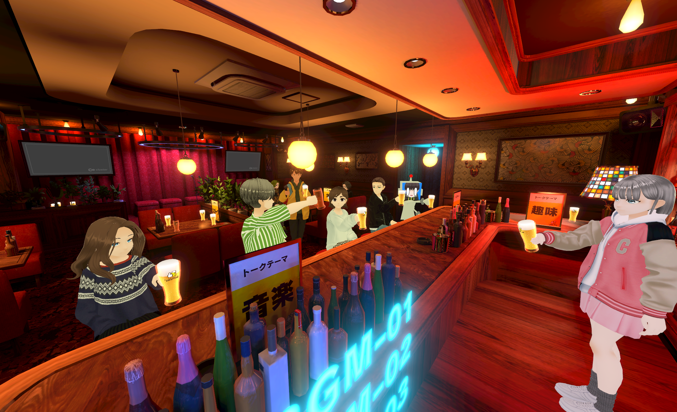・バーチャル空間の飲食店オーナーとユーザーや、ユーザー同士のコミュニケーションの機会を創出し、『THE DRAFTERS(ドラフターズ)』の体験価値である「“本当にうまい生ビール”を、いつでもどこでも楽しめる世界を創る」の充実を図ります。実際のスナック空間のように狭い空間をあえて再現しています。これまでのclusterのユーザーの多くに好まれる「オンラインコミュニケーション」の楽しさを感じられる空間作りの知見を活かした世界観になっています。