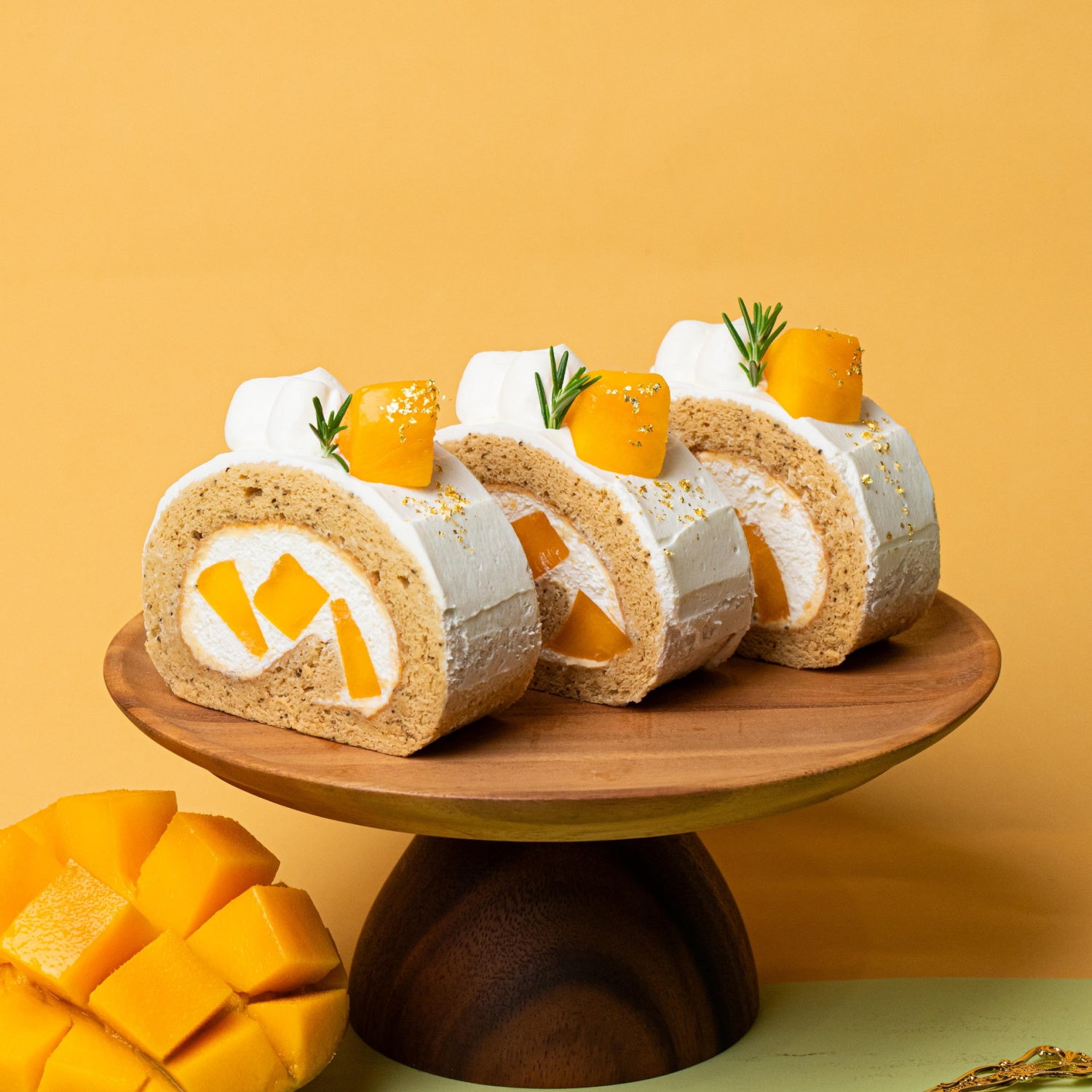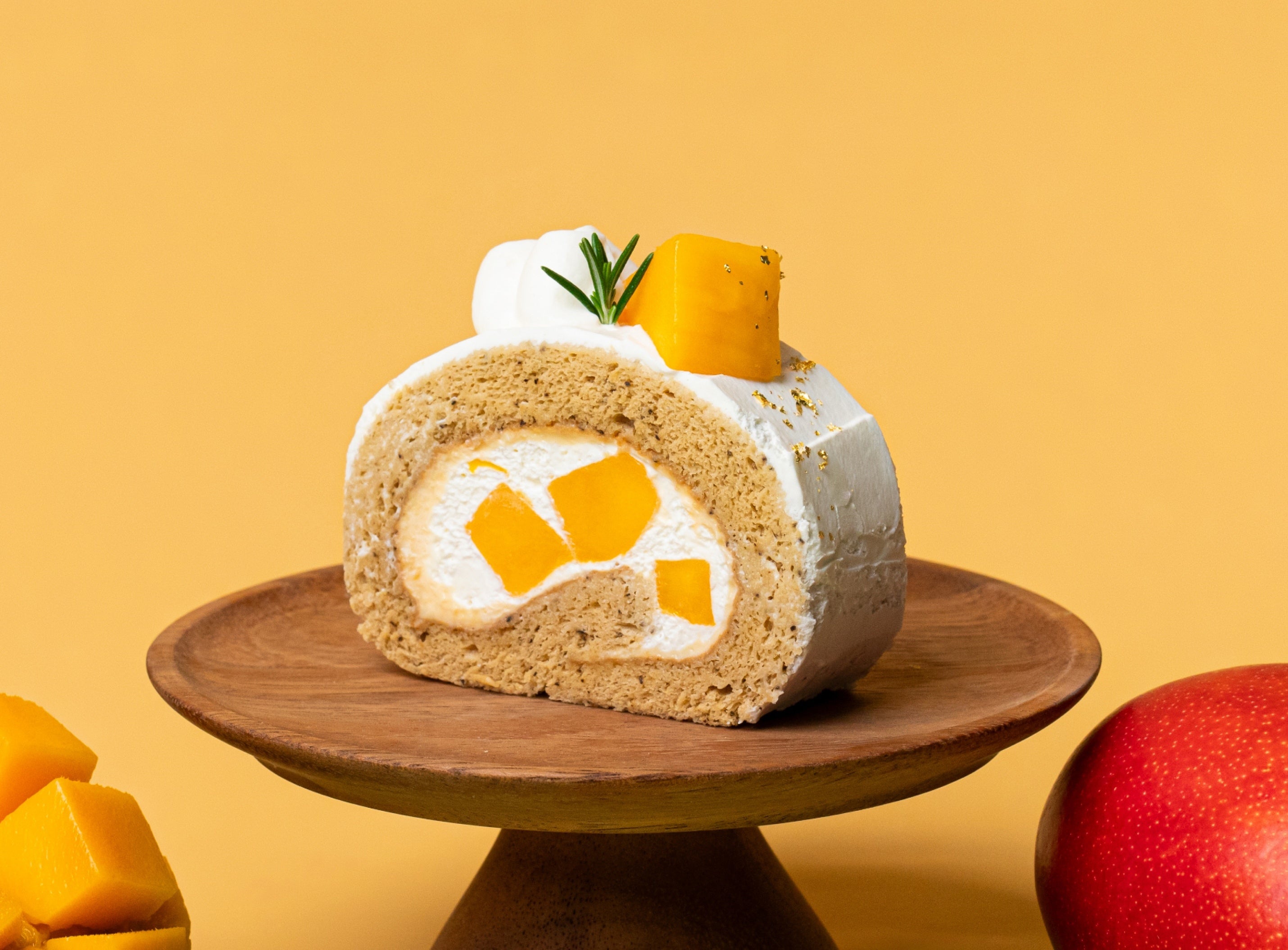 宮崎県産の完熟したマンゴーの果肉を、アールグレイパウダーを練り込んだしっとり生地で巻き上げました。