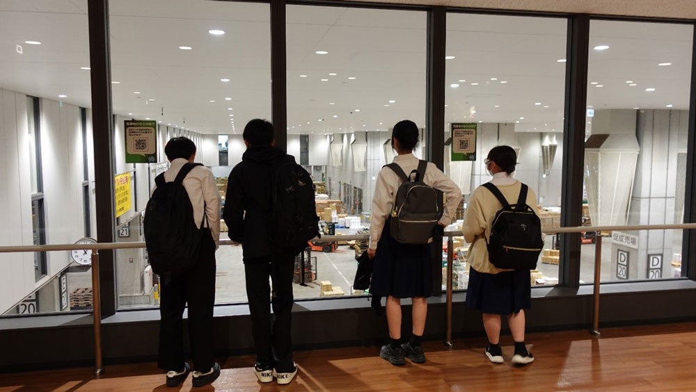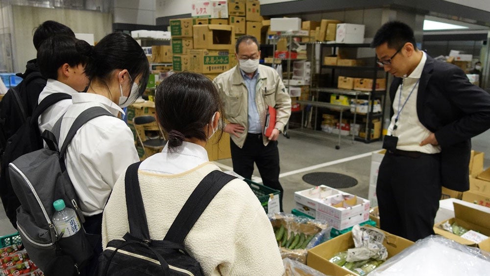 今回は、修学旅行で訪れた仙台市立中山中学校の生徒4名を対象に、豊洲市場青果棟のミニ見学会を実施。さらに座学では、コロナ禍においての「食べて応援学校給食」や「元気いただきますプロジェクト」など、食品ロスになりそうだった食材を支援する取り組みや、新しい食の開発による食品ロス削減の努力について紹介しました。
