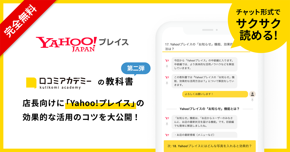 「口コミアカデミー」では、LINEヤフー株式会社公式監修のもと、「Yahoo!プレイス」の特徴や登録方法、使い方などについてわかりやすく解説する「Yahoo!プレイスの教科書」全20コンテンツを無料で提供しています。