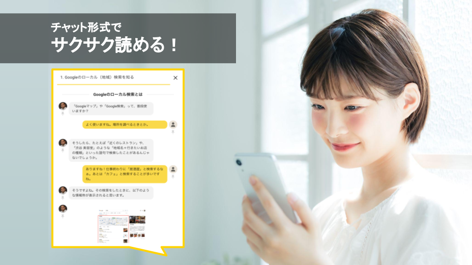 忙しい業務の合間にも気軽に読んでいただけるように、スマートフォンに最適化したチャット形式で、いつでもどこでも読み進められるように設計しております。
