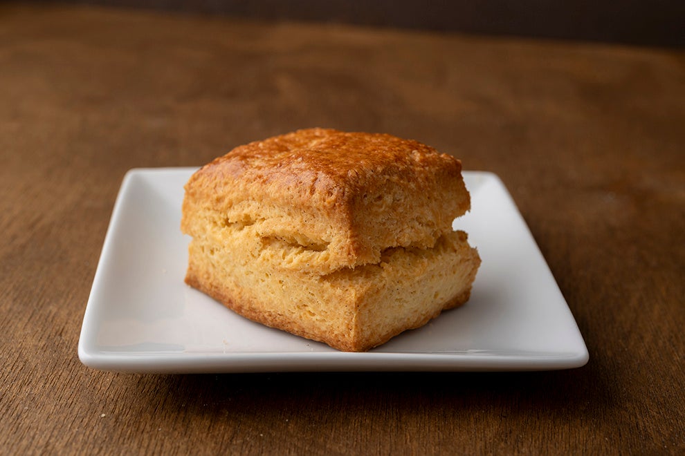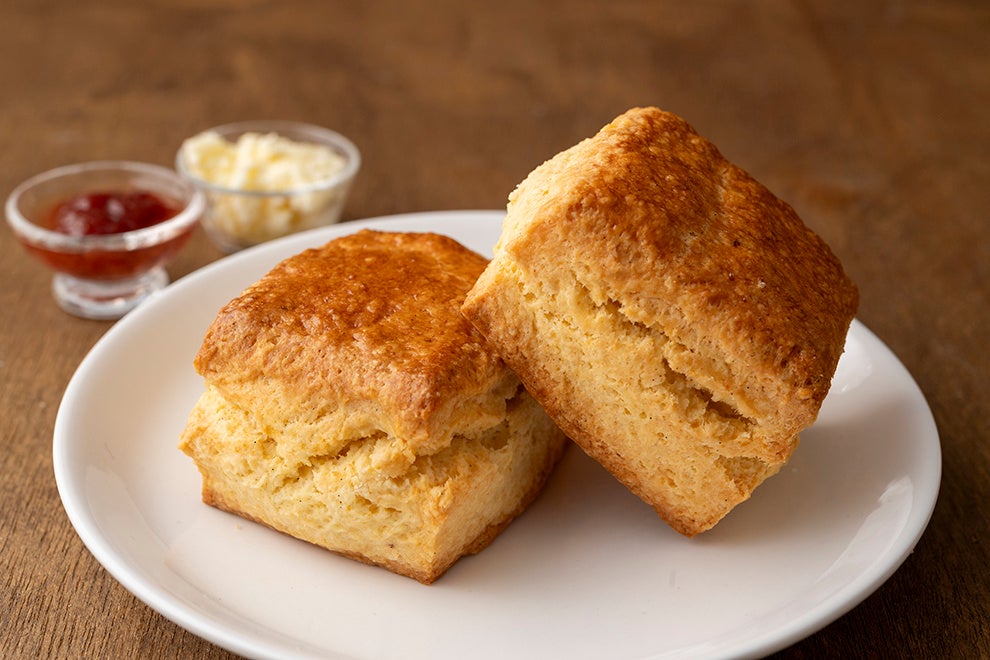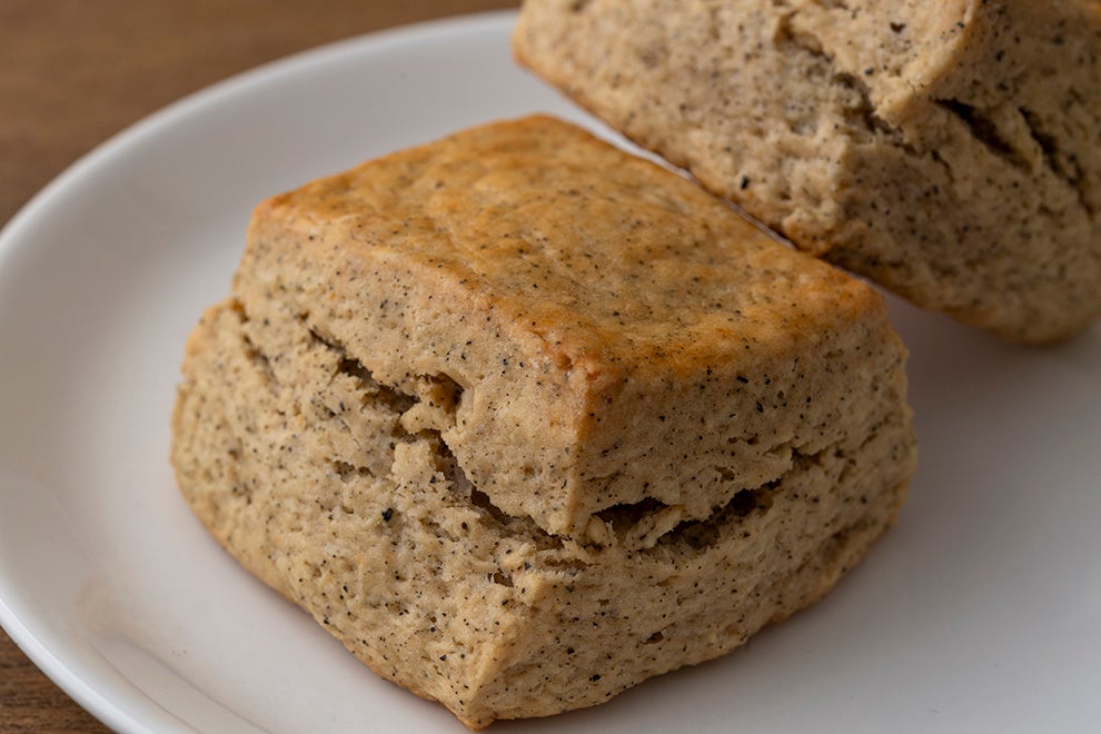 スコーンに使用する材料は、一般的に小麦粉、バター、砂糖、卵、牛乳、ベーキングパウダーなどです。特にプレーンは、小麦をダイレクトに感じられるため、上野シェフはフランス産のオーガニック小麦2種をブレンドして使います。外はさっくり、中はしっとりとした食感です。