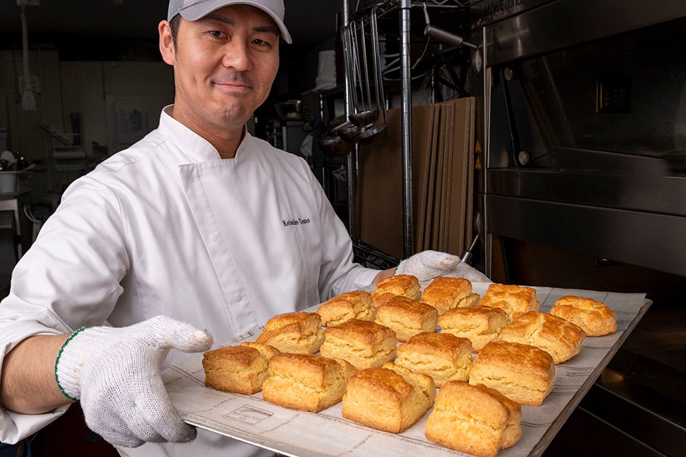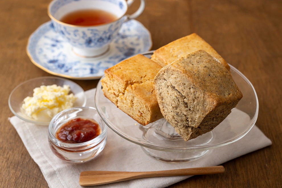 焼き菓子やスコーンのファンが多いことから、初夏の昼下がりのお茶の時間に楽しんでいただけるよう、王道のプレーン、スッキリとした味わいの和紅茶、静岡県産のレモネードのスコーンを特別にご用意しました。 百貨店等の催事でも人気のパティシエ、上野啓介シェフのスコーンは、しっとりとした食感が特徴です。それぞれのフレーバーがしっかり感じられるので、何もつけなくても楽しめます。