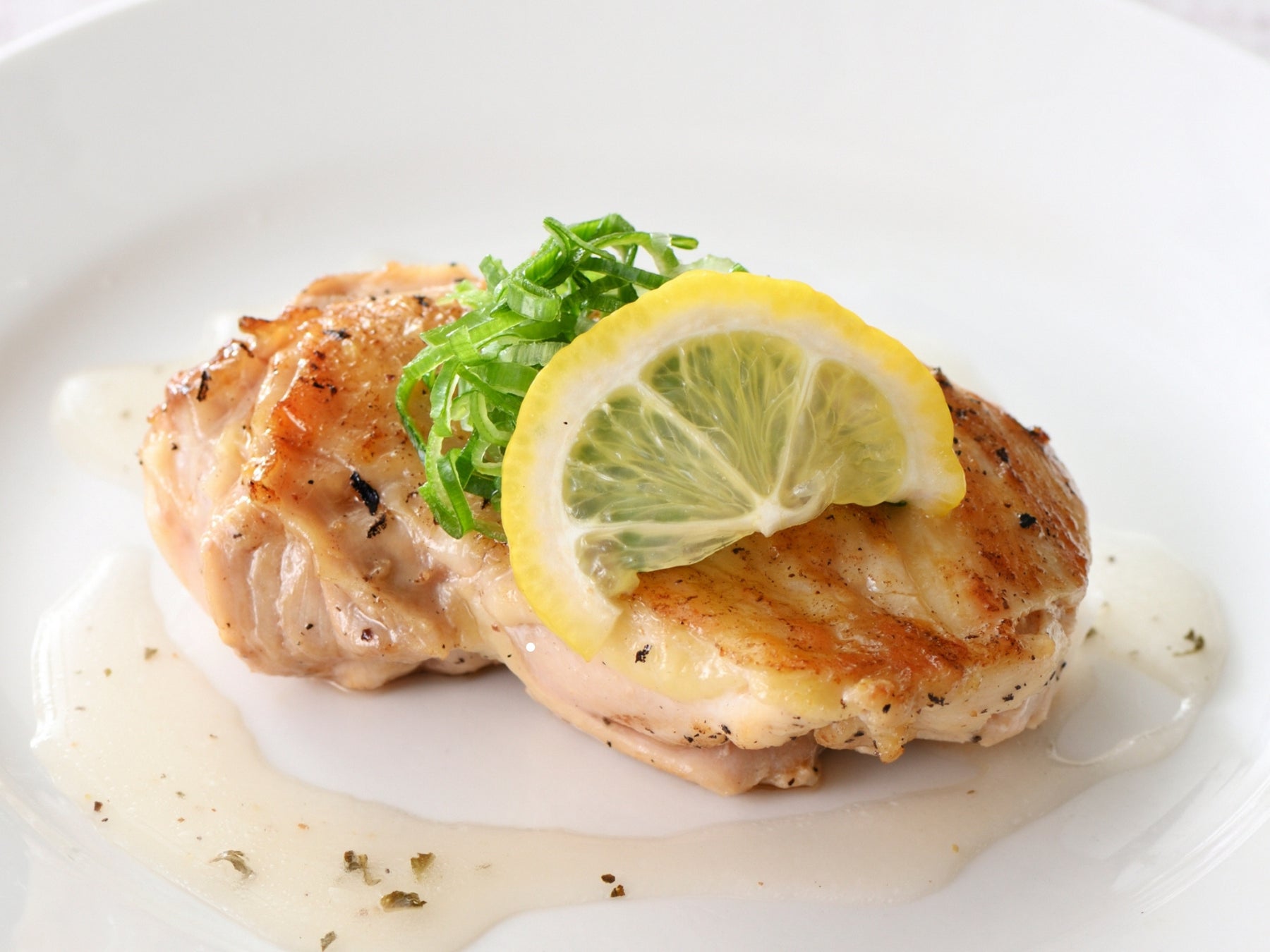 満喫コースでは、レモンのさわやかな酸味と黒胡椒のパンチの効いた香りが食欲をそそる『檸檬(レモン)ペッパーチキンステーキ』。
