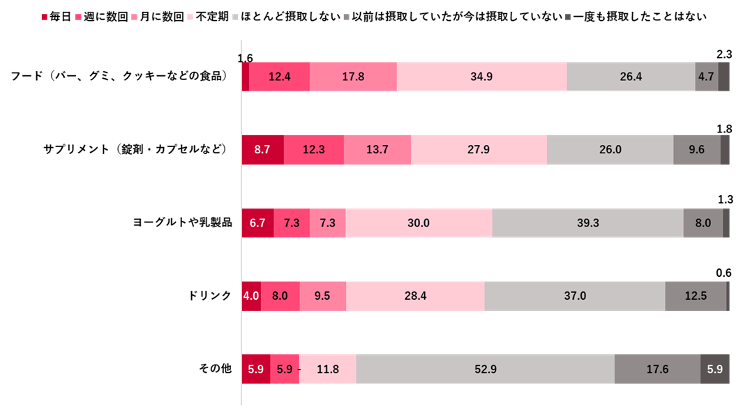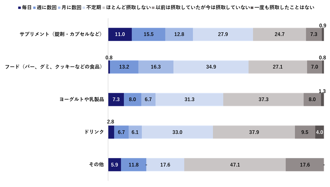 トクホまたは機能性表示食品の摂取歴がある方を対象に、商品の種類ごとに摂取頻度を聴取したところ、トクホでは「フード(バー、グミ、クッキーなどの食品)」、機能性表示食品では「サプリメント(錠剤・カプセルなど)」が高かった。