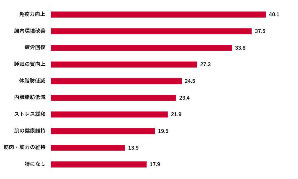 トクホや機能性表示食品に対して重視する効果は、「免疫力向上」が40.1%、「腸内環境改善」が37.5%、「疲労回復」が33.8%で上位だった。