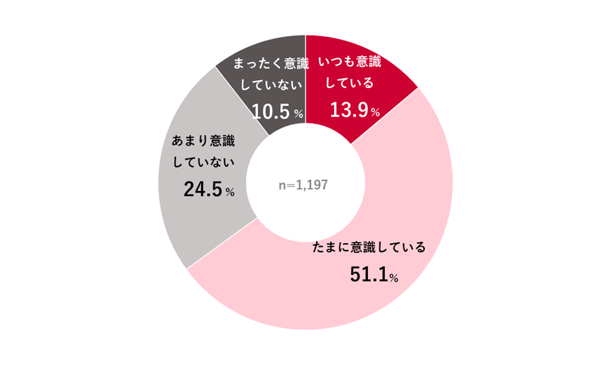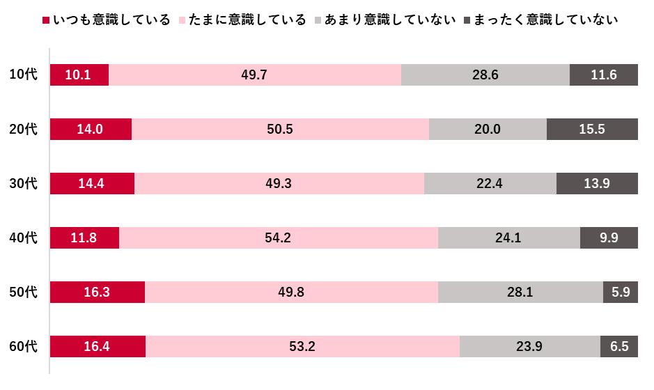 健康食への意識について聴取したところ、「いつも意識している」と「たまに意識している」を合わせた「意識している」は65.0%だった。年代別で見ると、60代の69.6%が最も高い。