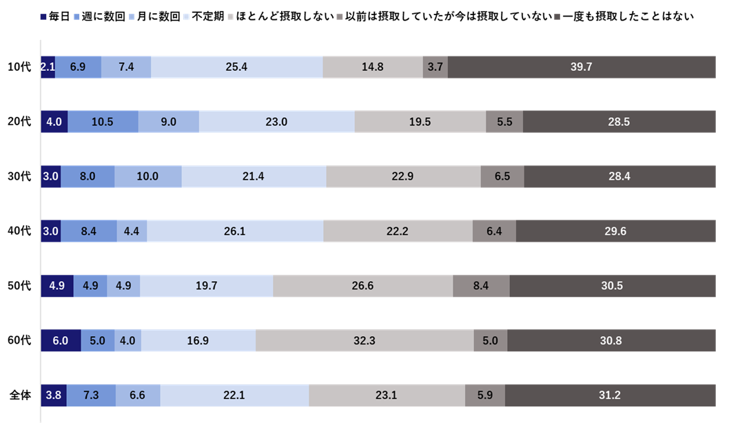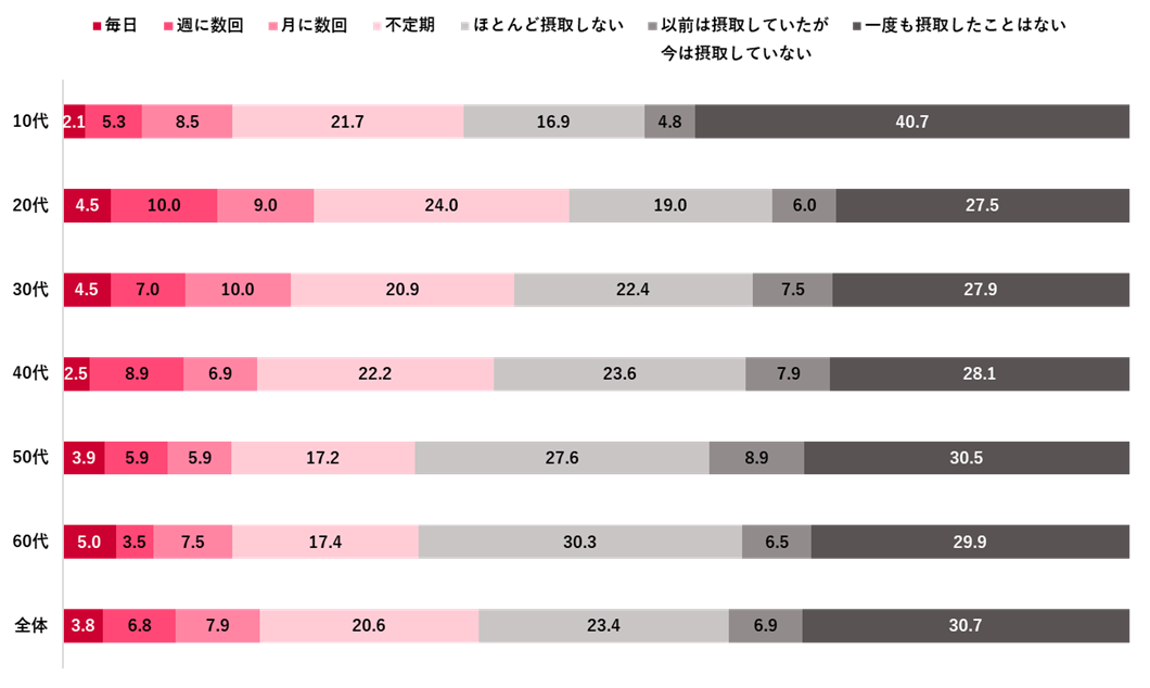 トクホおよび機能性表示食品の摂取頻度は20代が最も高く、およそ半数が摂取している