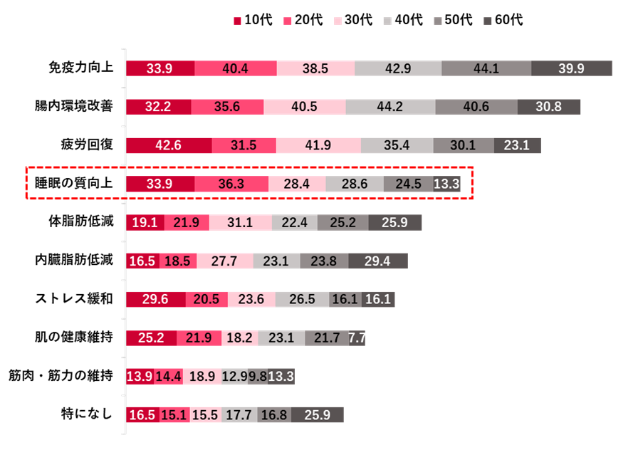 年代別で見ると、摂取頻度の高い20代では「免疫力向上」(40.4%)がトップ、次いで「睡眠の質向上」(36.3%)、「腸内環境改善」(35.6%)が続いた。「睡眠の質向上」は、30代~60代が10~20%台だったのに対して、10代と20代では30%を超えており、若年層で高かった。