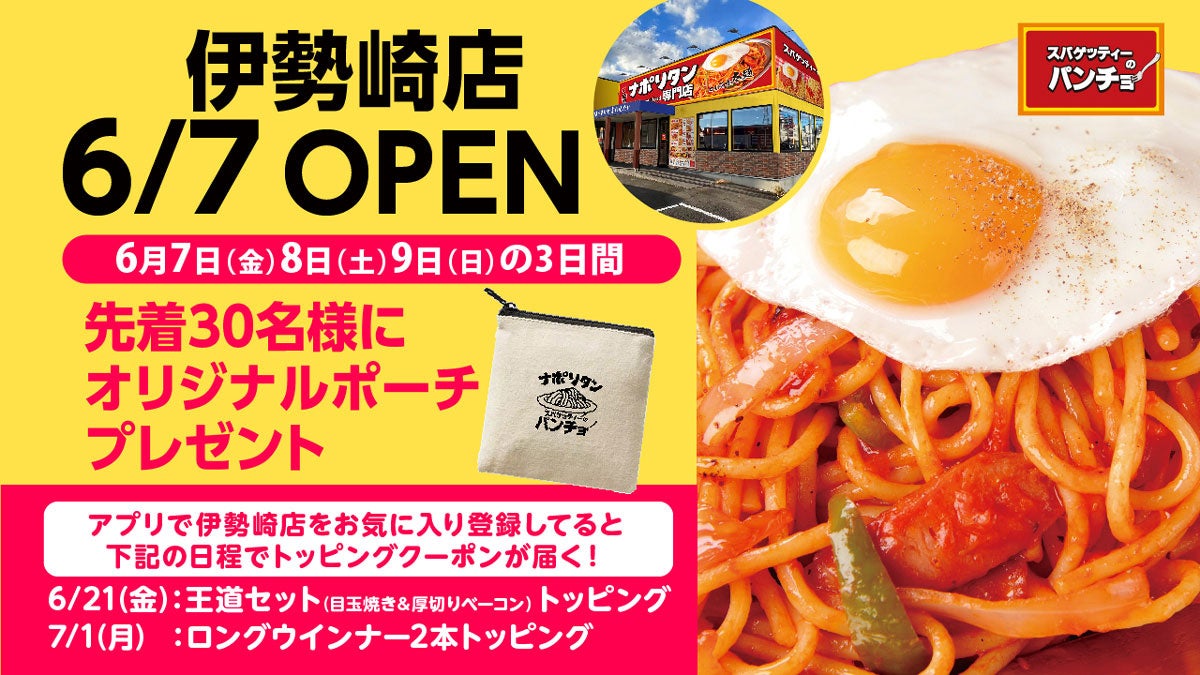オープニングキャンペーンとして6月7日(金)から3日間、毎日先着30名にオリジナルポーチをプレゼント。また公式アプリをダウンロードして伊勢崎店をお気に入り登録の方には無料で試せるトッピングクーポンを6月21日(金)と7月1日(月)に配信します。