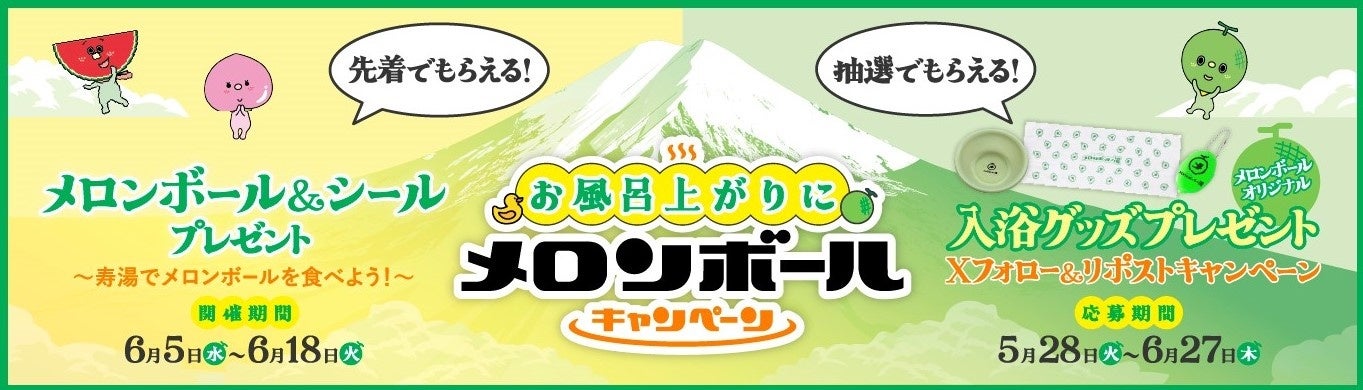井村屋株式会社(本社:三重県津市高茶屋七丁目1番1号、社長:岩本 康)は、「お風呂上がりにメロンボール」と題して2つのキャンペーンを開催いたします。5月28日(火)~6月27日(木)の期間中、X(旧Twitter)にて抽選でメロンボールオリジナル入浴グッズが当たるXフォロー&リポストキャンペーンを実施いたします。また、6月5日(水)~6月18日(火)には、メロンボールと東京都台東区にある「寿湯」がコラボした銭湯の展開を行います。