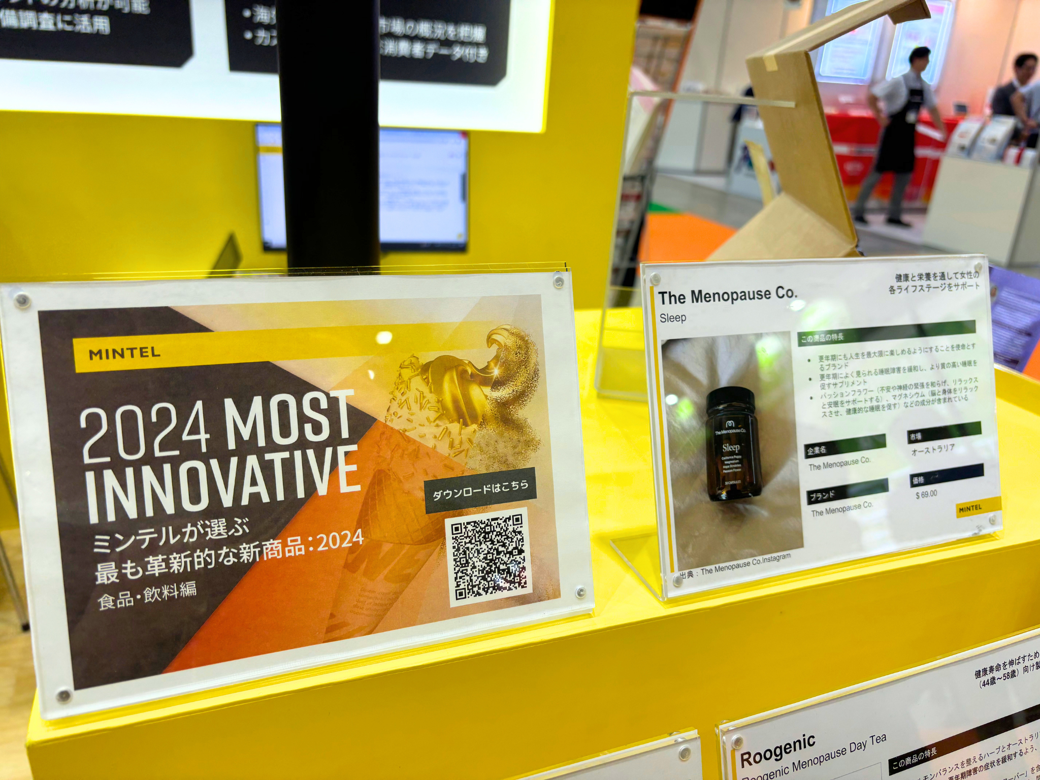 展示ブースでは、「健康と栄養を通して女性の各ライフステージをサポート」と題したミンテルのレポートでご紹介している、女性特有の身体の不調をサポートするサプリなどを世界各国から取り寄せ、展示しました。また、世界86市場の日用消費財を原料や訴求内容から検索することができる「ミンテル世界新商品データベース」や世界と日本における食品・飲料のトレンドが把握できるオンラインレポートシリーズ「ミンテルジャパンレポート」をご来場者の皆様にご紹介しました。
