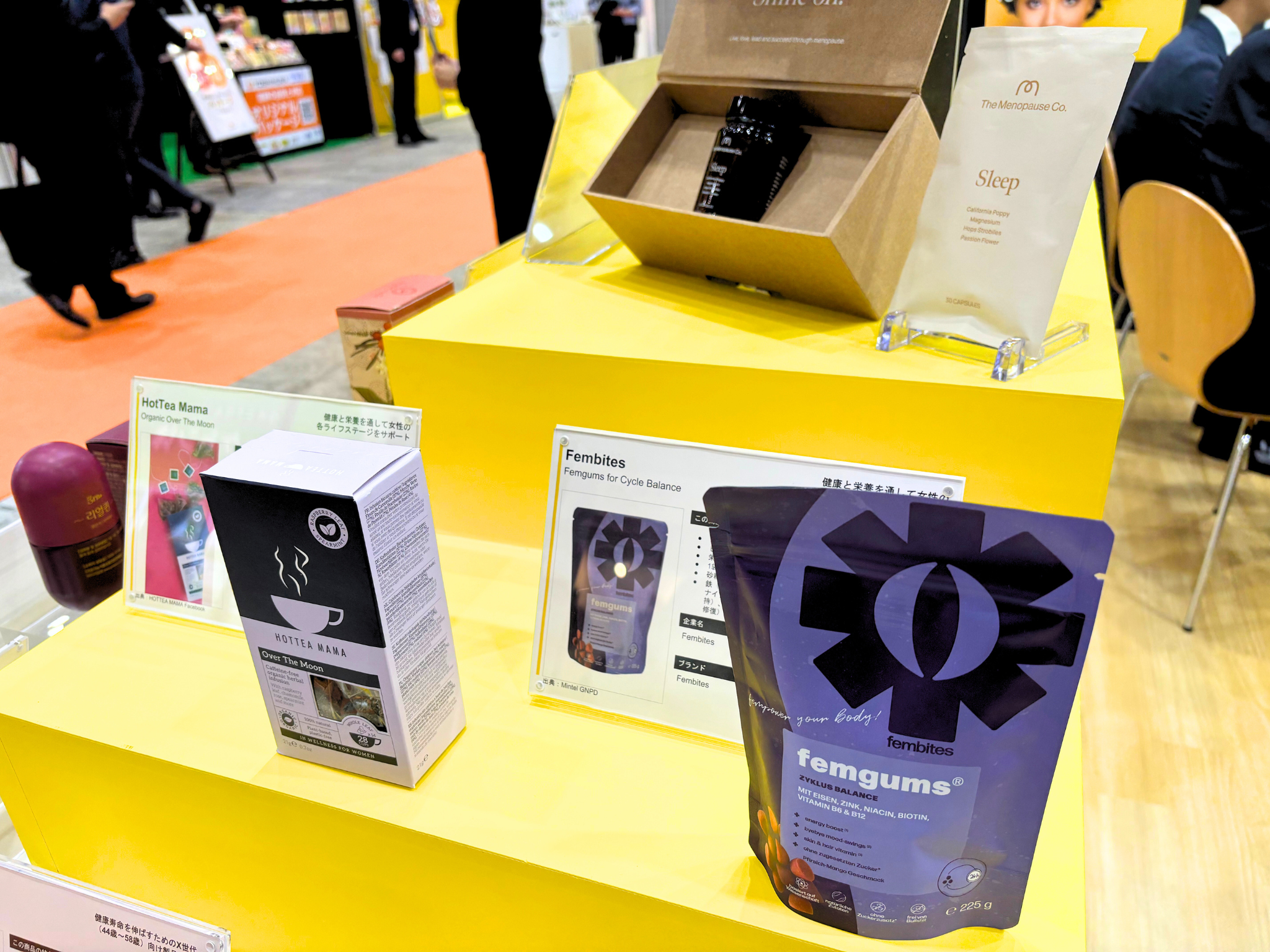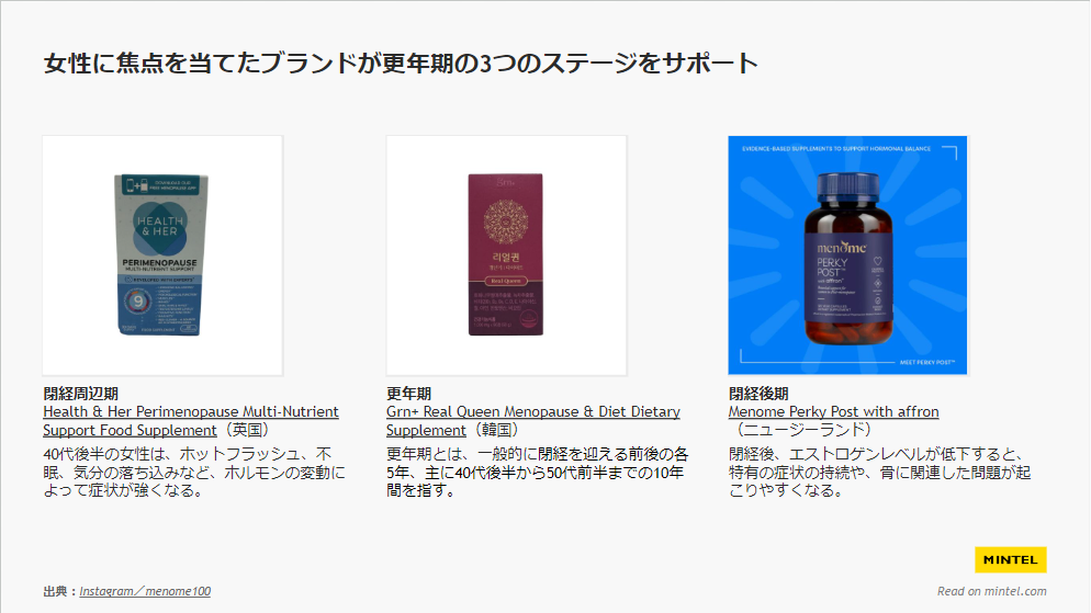 海外では、更年期を前期・中期・後期と分けて、それぞれの段階で生じる不調に対処する成分を配合したサプリの製品開発が見られます。またサプリではなく、日常的に摂取しやすいお茶やグミという形状で、こういった症状をサポートする商品も販売されています。ifia JAPAN 2024では、ミンテルのレポートでご紹介している、同分野の海外製品を展示しました。