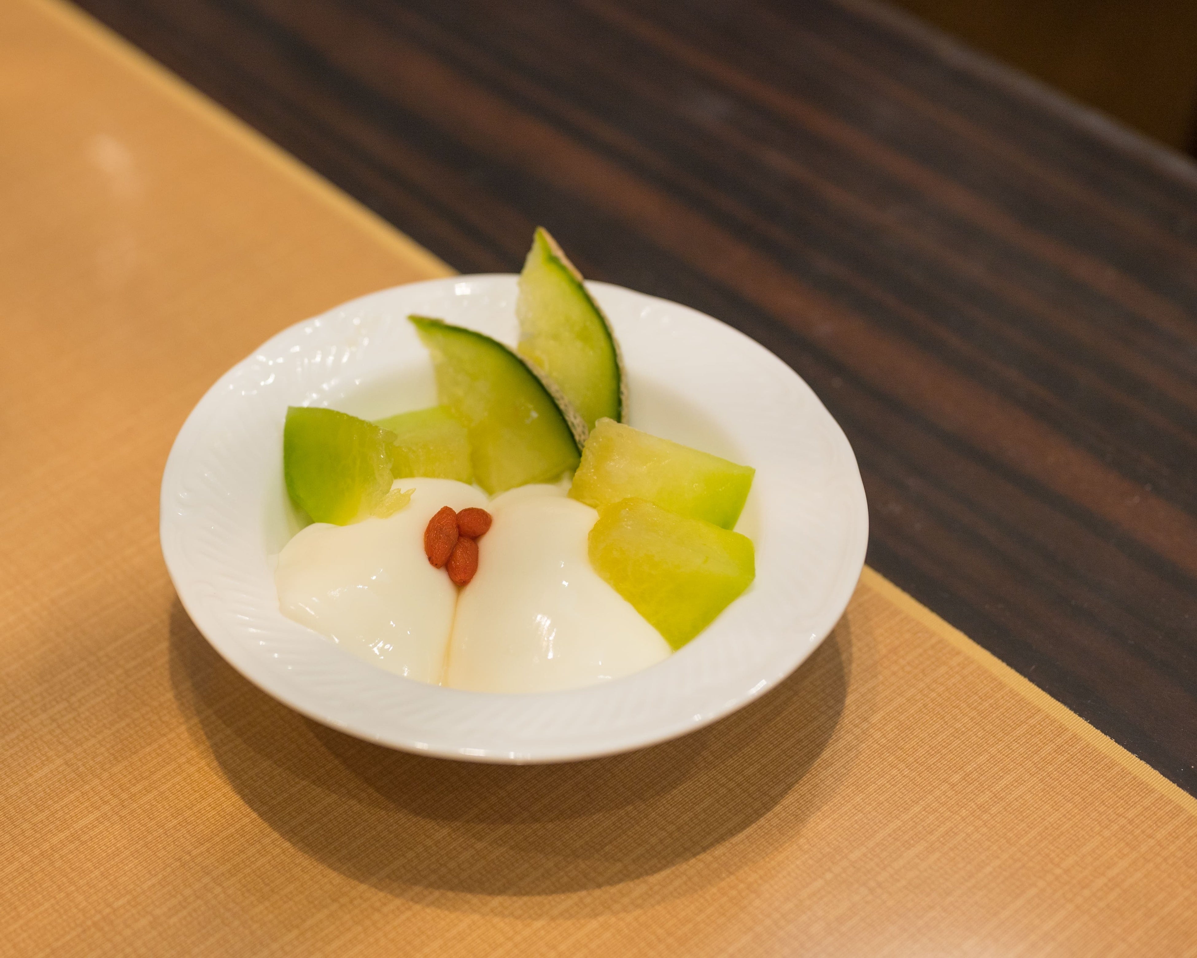 とろける杏仁豆腐にメロンを添えて。なめらかでつるんとした杏仁豆腐とジューシーなメロンが口の中でミックスされて、幸せいっぱいに。