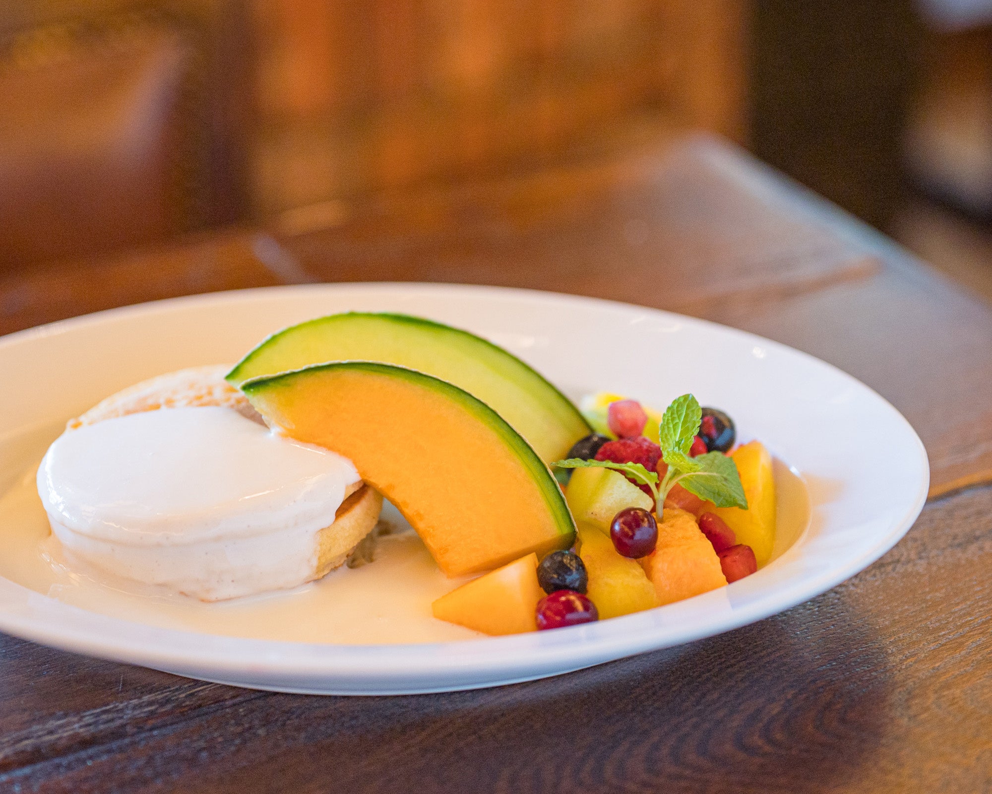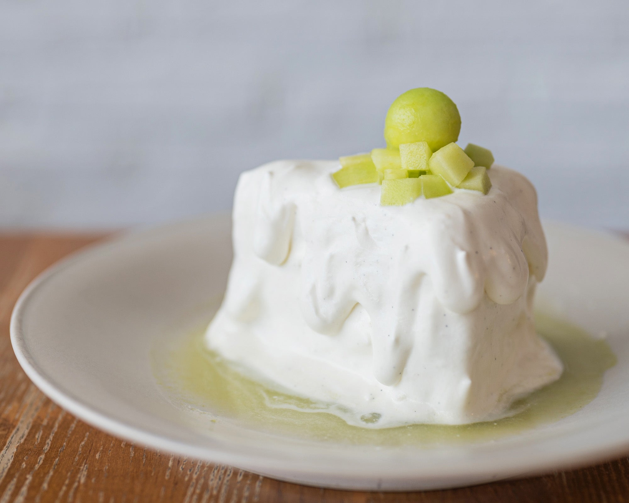 酸味をおさえたヨーグルトソースでパンケーキとメロンは最高のマリアージュに。