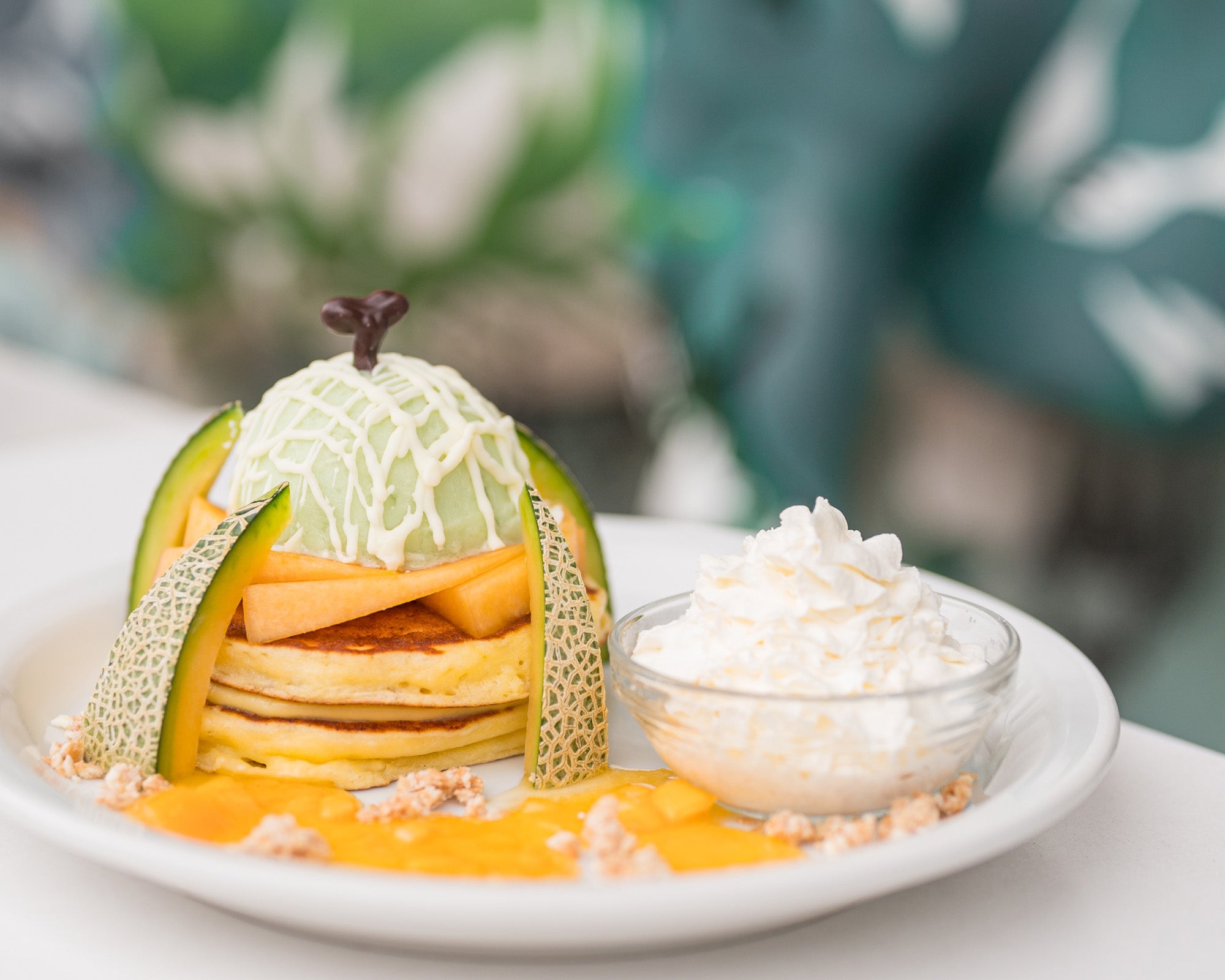 Urth Caféで一番人気のオートミール入りのパンケーキが2種類のメロンのみずみずしさを引き立てる。