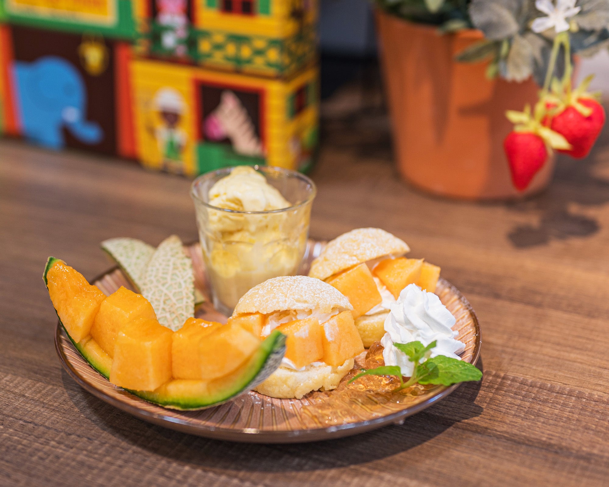 プチメロンパンに果肉とホイップをトッピング。お好みでバニラアイスを挟んでも♪