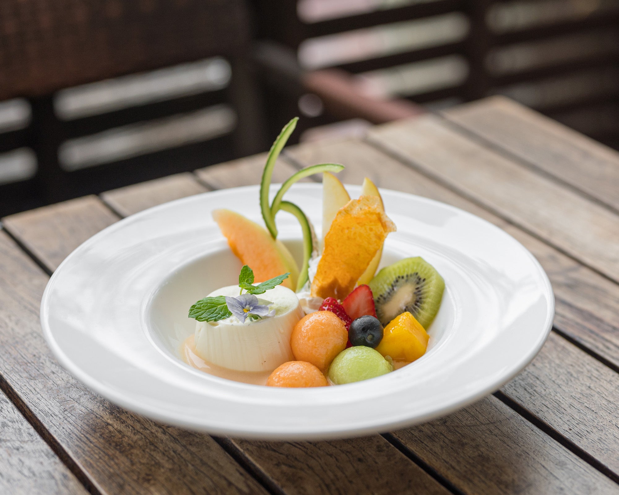 自家製メロンソースをかけたパンナコッタに、フルーツを添えてアラモード仕立てに。