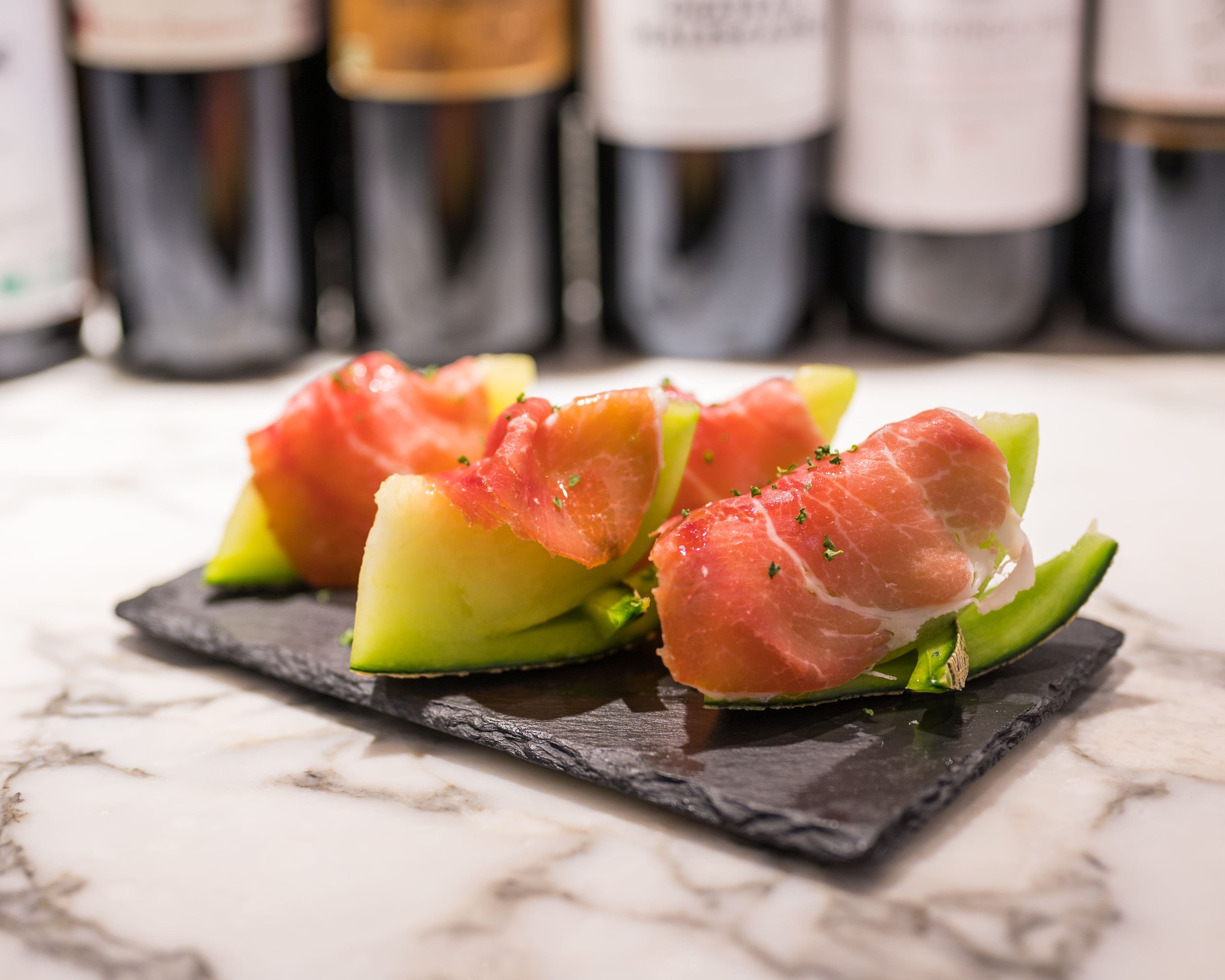 “甘じょっぱい”がクセになる究極の前菜。塩気のある熟成生ハムと一緒に食べることで、メロンの甘みが一層濃厚に。