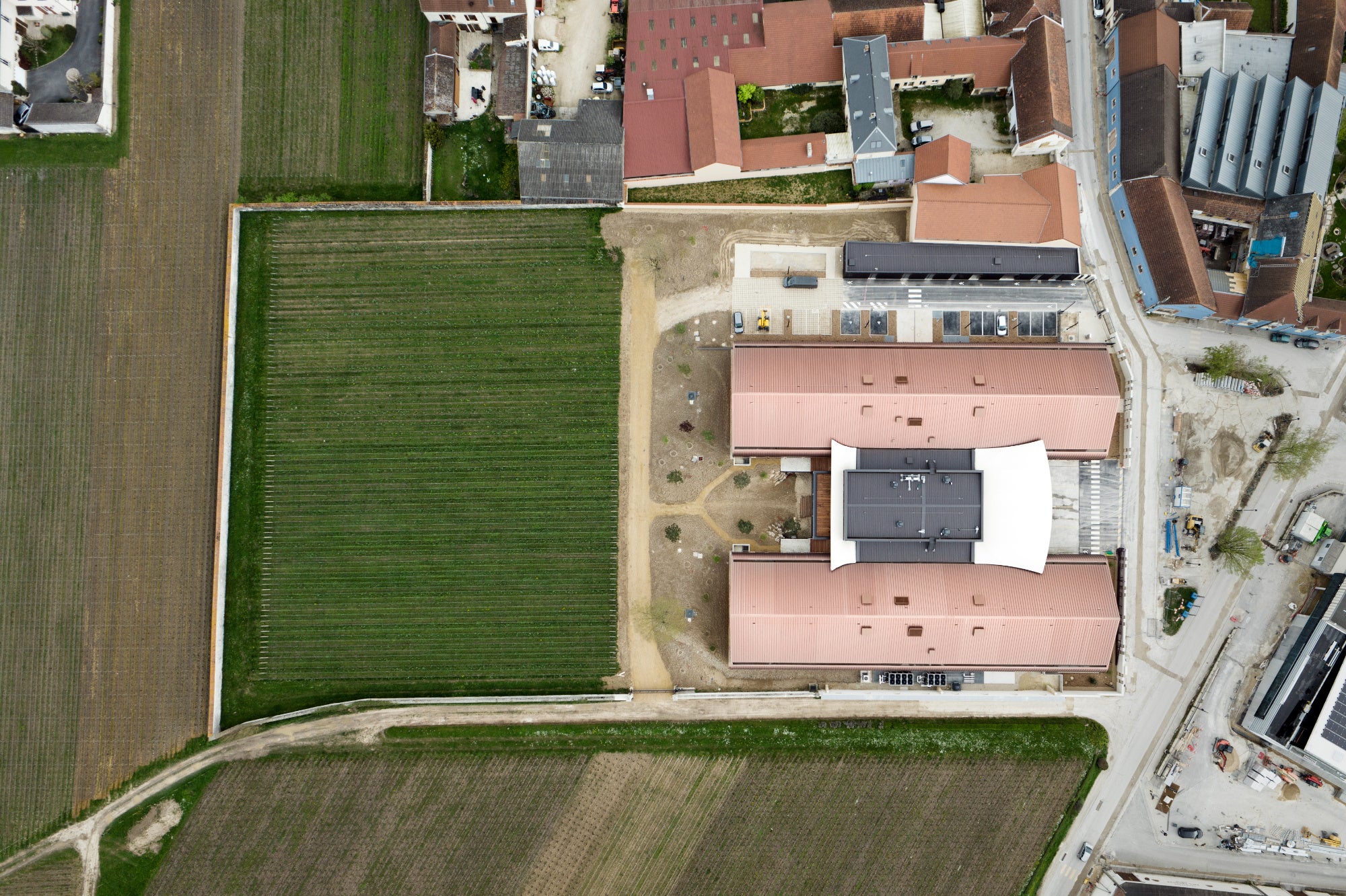 新施設は、ワイン醸造プロジェクトのスペシャリストである現地のプロジェクトマネージャーGNATと、2017年にランスのクリュッグファミリーハウスの見事な改修を手がけた建築事務所AW² architecture & interiorsとの相互補完的なコラボレーションにより実現。サステナビリティを中心に景観に溶け込んだ現代建築を目指しながら、アンボネイ村の素晴らしいテロワールに敬意を表したいという願いから、建設にあたっては、ひとつひとつの工程に細心の注意が払われてきました。村の景観と調和するようにデザインされた現代建築は、低層部を繋げることで回遊性を確保した上で、対になる2棟の建物を垂直に配置。占有面積と視覚的影響を最小限に抑えることで、ミニマリスト的な美学を持ちながらも、周囲の景観に調和する有機的な線を持つ設計に仕上げました。セラーを覆うアーチ状の2つの大きな屋根は、クリュッグの樽での醸造技術をイメージし、また村に暮らす人々の営みと調和するようなブロンズカラーに仕上げました。村の原風景と見事な調和を見せる真新しいワイナリーは、豊かな遺産と力強い現代的なエネルギーの架け橋となっています。