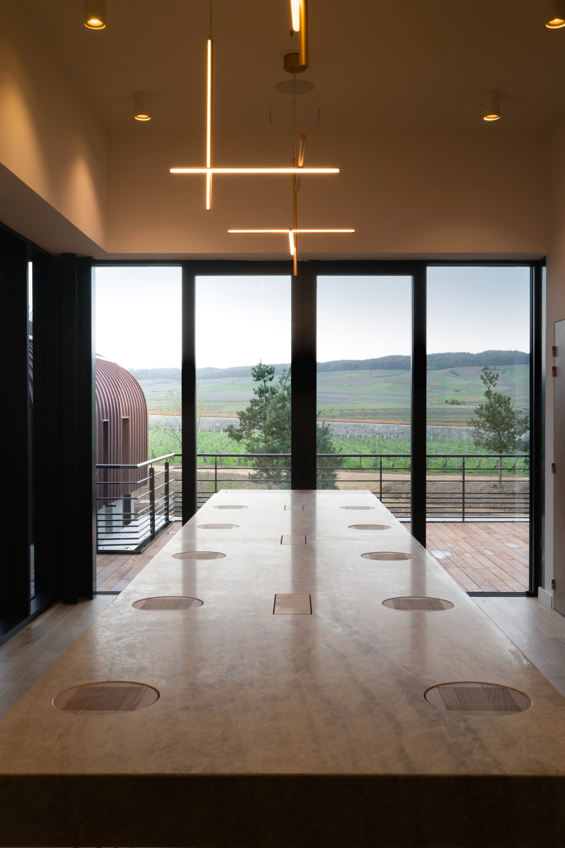 レイアウトには、既存の施設の一部を建材として再利用。コンクリートにメゾンの遺産の一部を組み合わせるという革新的なアイデアにより、都市的な面と牧歌的な面を併せ持つワイン生産地域らしい精神を体現させました。視界が開けるように設計されたテラスエリアは、シャンパーニュ造りにおける新たなインスピレーションを与える空間となっています。石組みの壁と再整備された庭との調和により、建物はブドウ畑とエレガントに融合しています。施設内のあらゆる場所で、見事なパノラマの眺望と自然採光を最大限に活かすことが特に考慮されています。