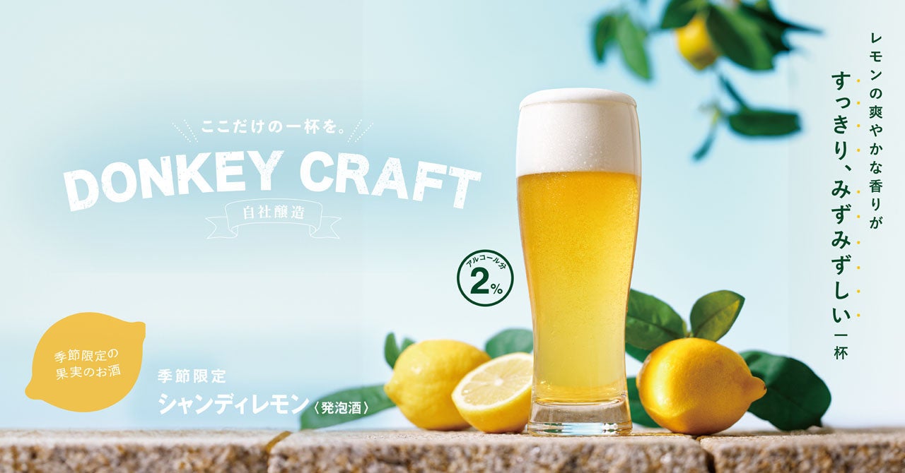 「ドンキーフリー(レモン)」は、様々なシーンで多くの人に「シャンディレモン」の風味や味わいを愉しんでいただけるノンアルコールメニューとなっております。お酒が苦手な方でもびっくりドンキーならではの爽快なレモンの味わいを愉しんでいただくことができます。