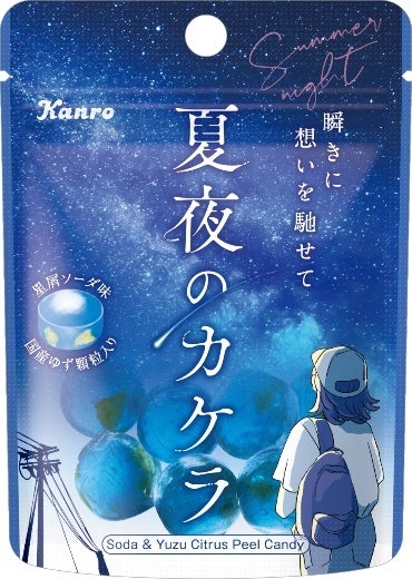 この度、コンパクト形態で「夏夜のカケラCANDY」を新発売します。「夏夜のひとカケラをキャンディに」というコンセプトを表現する、星が浮かぶ夏の夜空を切り取ったような美しい青色の飴粒は、大人っぽい「星屑ソーダ味」。国産ゆず顆粒を飴に練り込むことで、口に入れた瞬間に豊かな香りが広がり、初夏にぴったりな味わいに仕上げました。