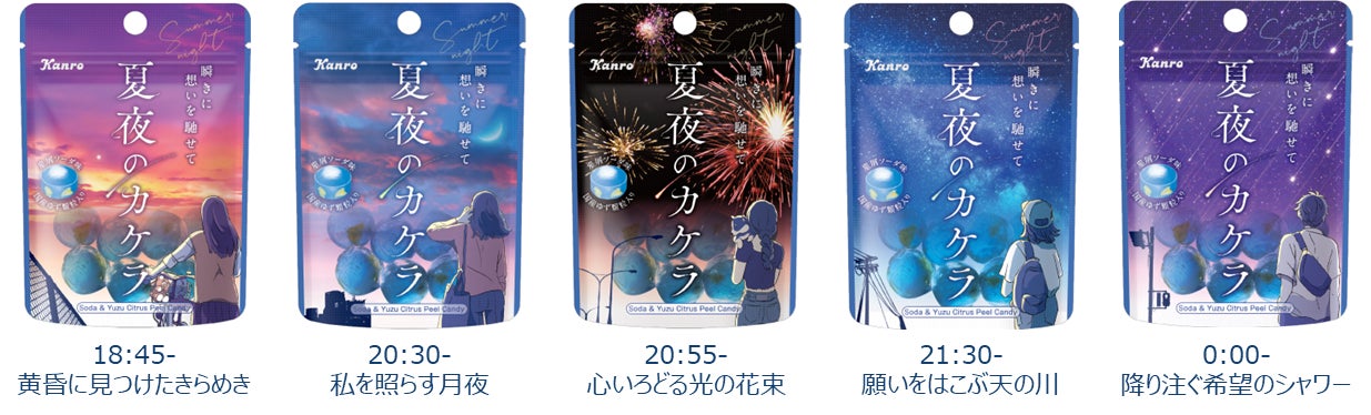 パッケージは、うっすら明るさが残る空から、午前零時の深い夜まで、時間によって変化する夏の夜空のワンシーンを切り取った全5種類のデザインに仕上げています。透明な包材を使用することで、夏夜のカケラを表現した美しい飴粒がパッケージから透け、空からこぼれ落ちてくるようにも見える情緒的なデザインとなっております。