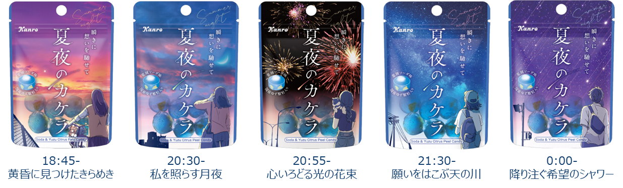 パッケージは、うっすら明るさが残る空から、午前零時の深い夜まで、時間によって変化する夏の夜空のワンシーンを切り取った全5種類のデザインに仕上げています。透明な包材を使用することで、夏夜のカケラを表現した美しい飴粒がパッケージから透け、空からこぼれ落ちてくるようにも見える情緒的なデザインとなっております。