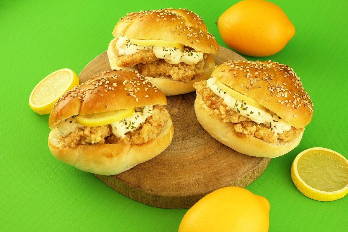 チキンフィレ竜田揚げにタルタルソースとレモンスライスをのせ、ふわふわのパンにサンドしました。まろやかなタルタルソースにレモンの酸っぱさがアクセントとなり、食欲をそそる味わいです。