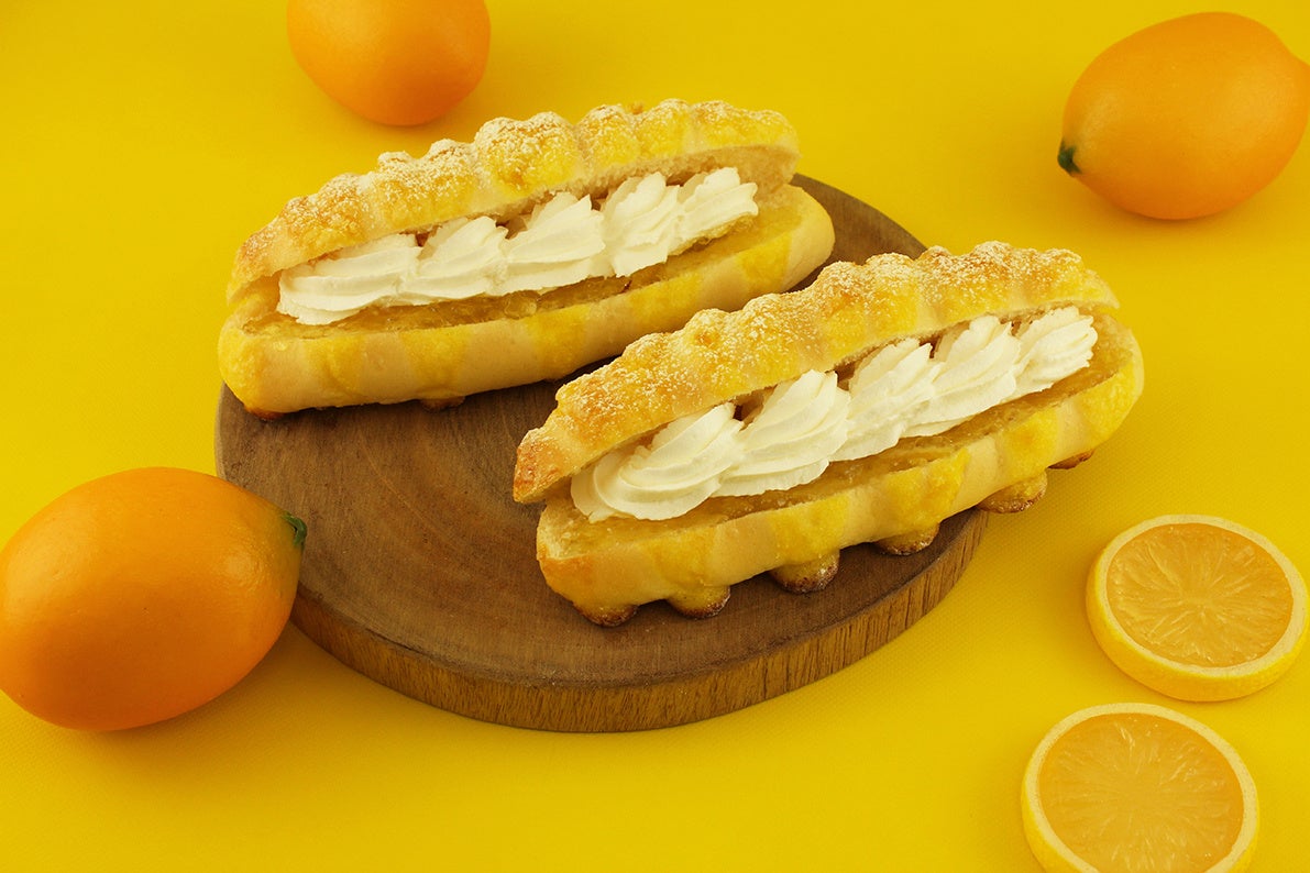 瀬戸内産レモンのピール入りレモンマカロンフィリングをトッピングしたパンに、みずみずしい味わいのレモンマーマレードジャムとホイップクリームをサンドしました。マカロンを思わせる食感と、レモンの酸味とホイップクリームの甘さがベストマッチ。デザートにもぴったりのパンです。