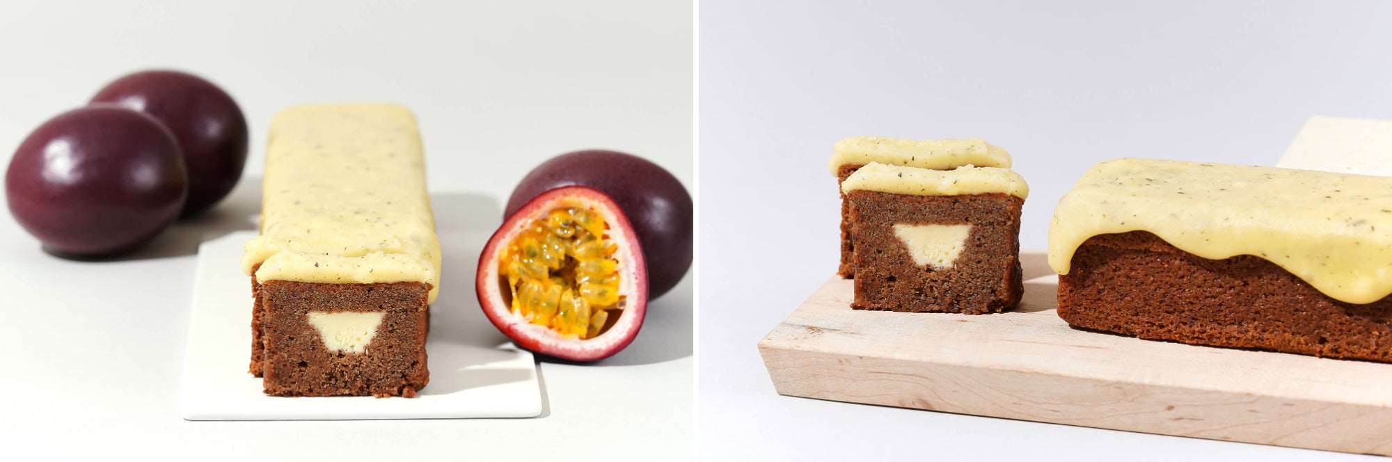 パッションフルーツは、上部のグラサージュとガトーショコラ生地、そして中央のホワイトチョコレートのガナッシュ、全てのパーツにたっぷり用いることで、どの部分を召し上がっても甘酸っぱいパッションフルーツの風味を感じていただけます。