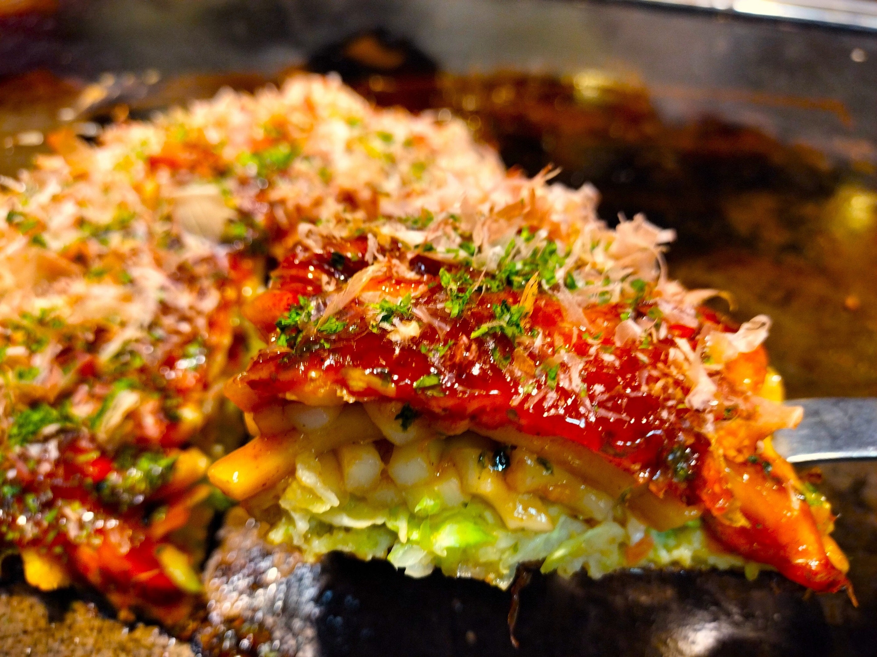 大阪の難波で四代続くお好み焼屋で、ミシュランガイド京都、京都・大阪のビブグルマンやお好み焼き100名店にも名を連ねた地元だけではなく観光客にも人気のお店です。難波本店の人気商品『味乃家ミックスお好み焼』にうどん麺を使ってもちもち食感が楽しめる『うどんモダン焼』にアレンジしました。