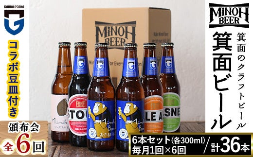 世界のビールコンテストで何度も金賞に輝いた、箕面ビール6本を毎月1回お届け。「ガンバおさる」デザインの豆皿もセットになっています。
