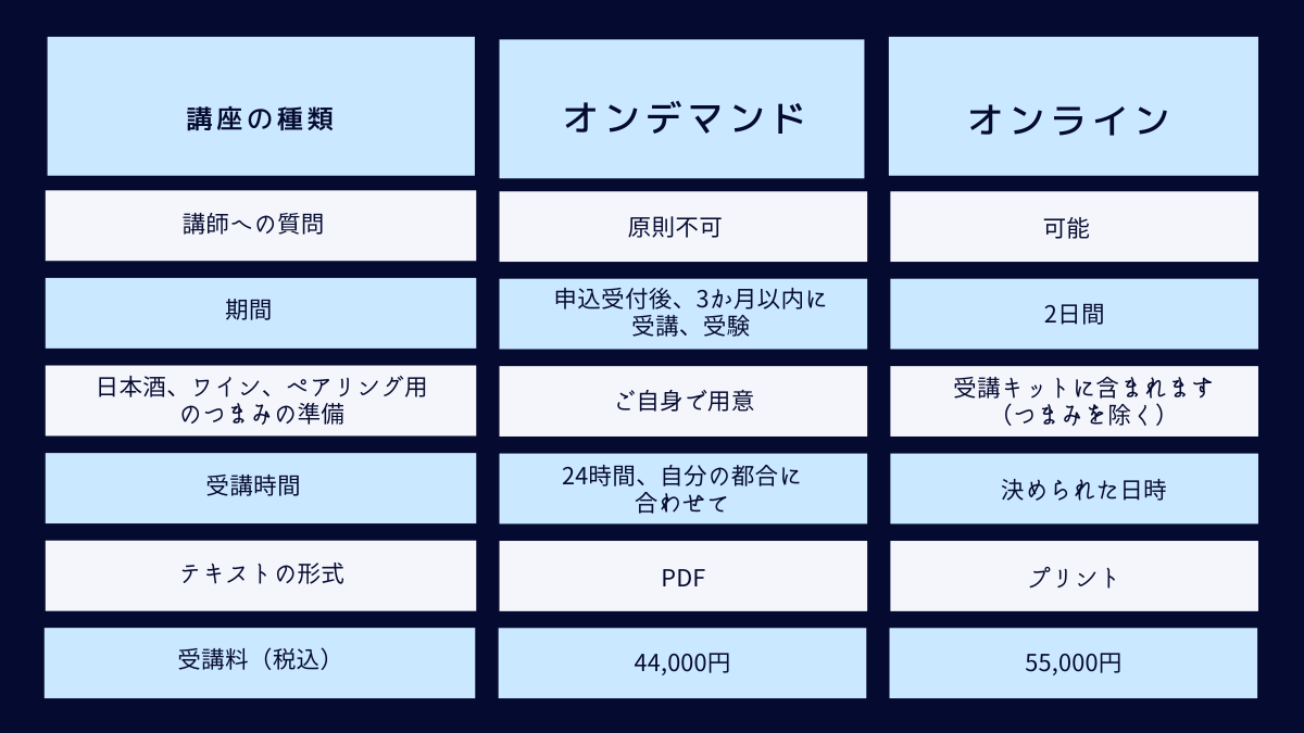 時差を気にすることなく、世界中の日本語を理解する人々が講座を受けることができます。日本酒の基礎知識、料理とのペアリング、そして飲酒と健康に関する科学までを幅広く学べます。