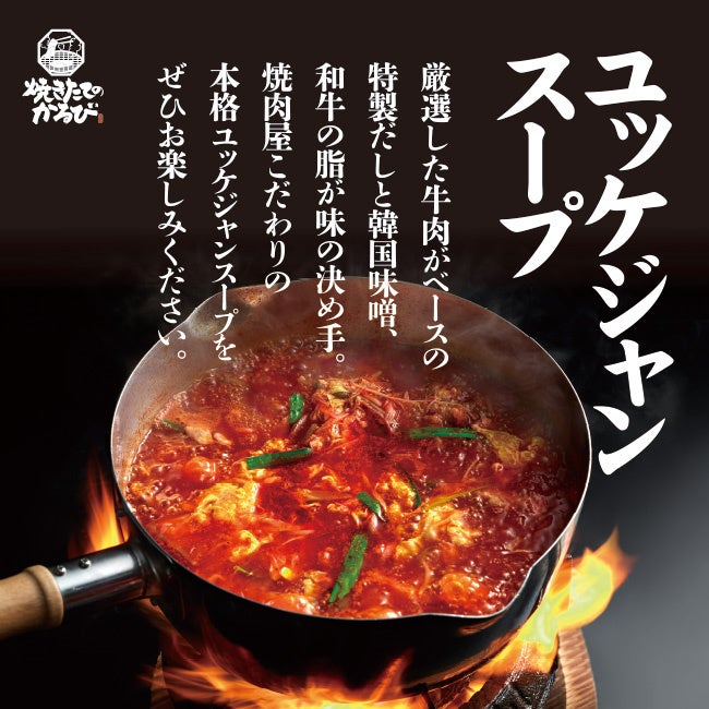 熟成肉を使用した「焼きたてのカルビ丼」と厳選した牛肉の旨みが特徴の「ユッケジャンスープ」の専門店。美味しい食事をリーズナブルな価格で、お気軽に召し上がっていただけます。 看板商品の「焼きたてのカルビ丼」はご注文いただいてからカルビ肉を強火で一気に焼き上げて、肉本来の旨味と香ばしさを引き立てます。タレは20種類の調味料を秘伝の配合でブレンドし、甘み、辛味、酸味を絶妙なバランスで仕上げました。もう一つの看板商品「ユッケジャンスープ」は、厳選された牛肉がベースの特製だしに、辛味のある韓国合わせ味噌とコチュジャンで味に深みをもたせました。スープを口に運んだ瞬間に、牛肉の旨味がふわっと広がる逸品です。