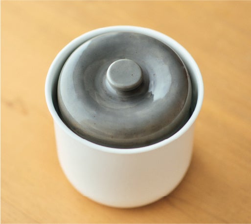 「琺瑯の手しごと容器」用に作った有田焼の漬物石。丸みのあるやさしくあたたかな佇まいで、本体と合わせることで押し蓋の役割も兼ねます。重さを足したい時は漬物石同士でスタッキングも可能です。