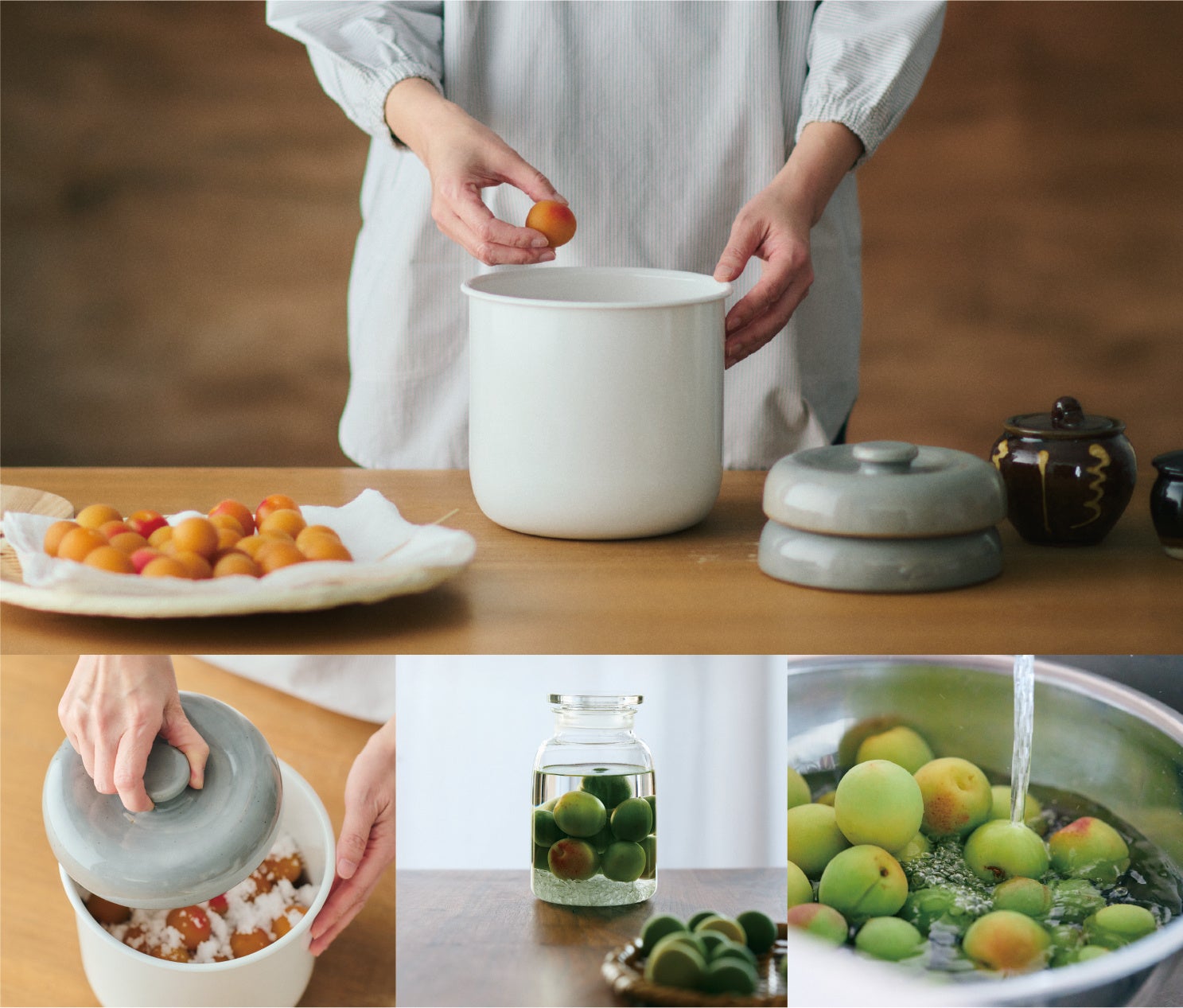日本の工芸に根差したものづくりをする中川政七商店はこの度、梅干しや漬物などの「自家製保存食」を自宅で楽しむアイテムとして、使い勝手と佇まいにこだわった琺瑯容器と漬物石を発売。柴田文江氏をデザイナーに迎え、角に大きくカーブを付けた“佇まいあるデザイン”と、かき混ぜやすさや持ちやすさ等の“使い勝手”にこだわった道具が完成しました。長時間の熟成と小まめな手入れが必要な自家製保存食は、いつでも目につく場所に置いておきたいものです。台所に出しておいても様になるインテリアに溶け込む道具により、旬の食やひと手間を愛でる時間が一層豊かになることを願っています。