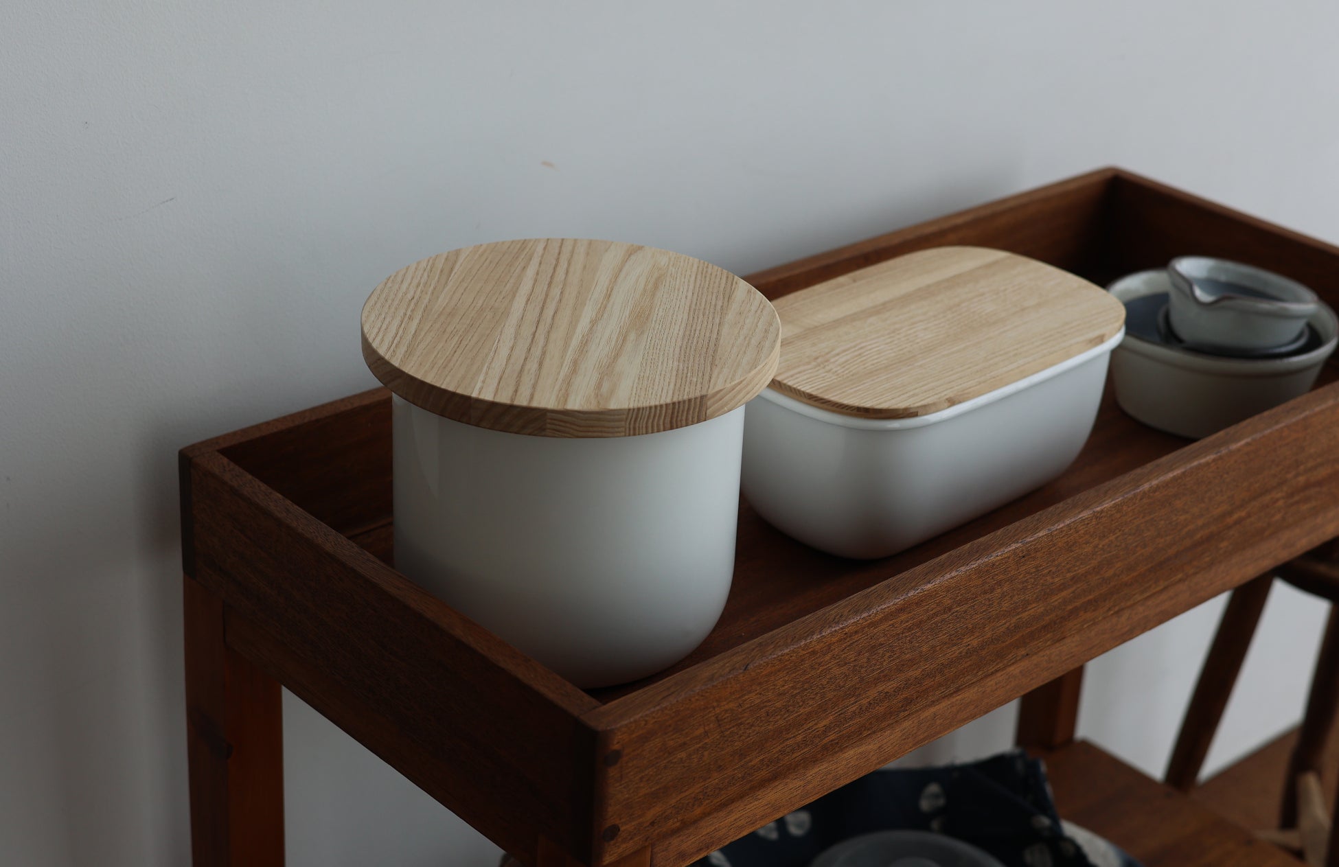 梅干しや味噌作り等に多用できる容器は、角に大きくカーブを付け、洗いやすく中身が混ぜやすい形に仕上げています。本体には食品の保存に最適な琺瑯を採用し、温かみのある木蓋を合わせました。和洋を問わずどんな台所にも馴染む、自然な佇まいです。容器に合わせて作った漬物石は有田焼製。丸みのあるやさしくあたたかな佇まいで、本体と合わせることで押し蓋の役割も兼ねます。