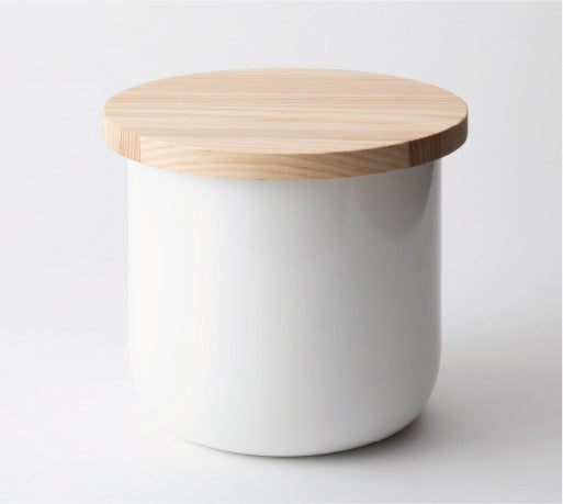 梅干しや味噌作り等に多用できる容器は、角に大きくカーブを付け、洗いやすく中身が混ぜやすい形に仕上げています。本体には食品の保存に最適な琺瑯を採用し、温かみのある木蓋を合わせました。和洋を問わずどんな台所にも馴染む、自然な佇まいです。容器に合わせて作った漬物石は有田焼製。丸みのあるやさしくあたたかな佇まいで、本体と合わせることで押し蓋の役割も兼ねます。