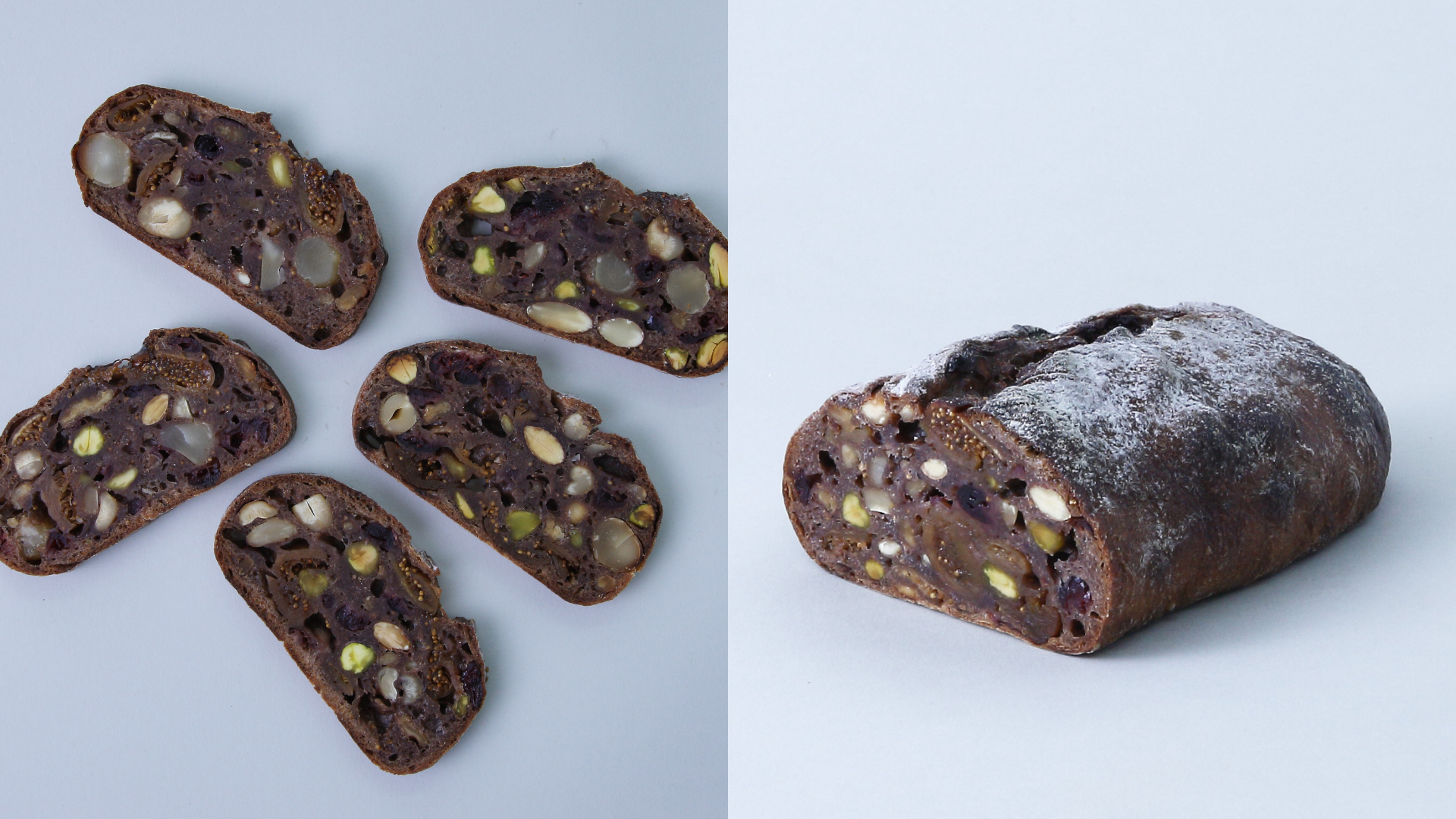 煮詰めた赤ワインで仕込んだ生地に、5種類のナッツやイチジク、クランベリーを贅沢に入れたパンです。
