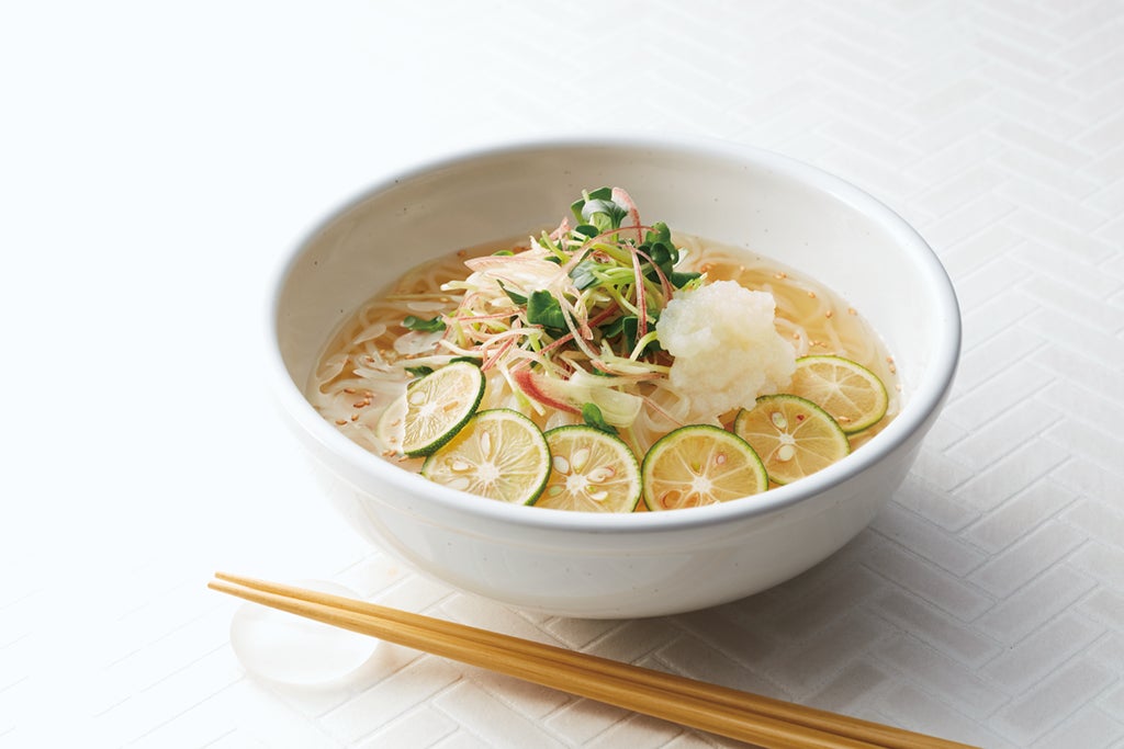 徳島県産のすだちを使用した、夏にぴったりの爽やかな冷麺です。たっぷりの薬味と一緒に、さっぱりとお召し上がりください。