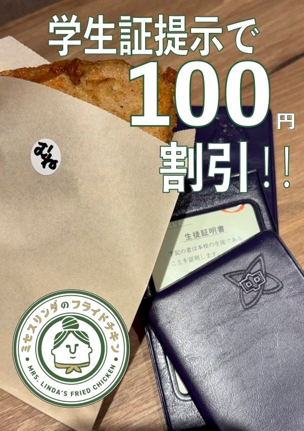 2024年6月1日 〜 期間限定!京都錦市場にあるフライドチキン専門店「MLチキン」は、修学旅行生および地元学生の皆様を対象に、学生証を提示するだけで、税込価格から100円の割引!