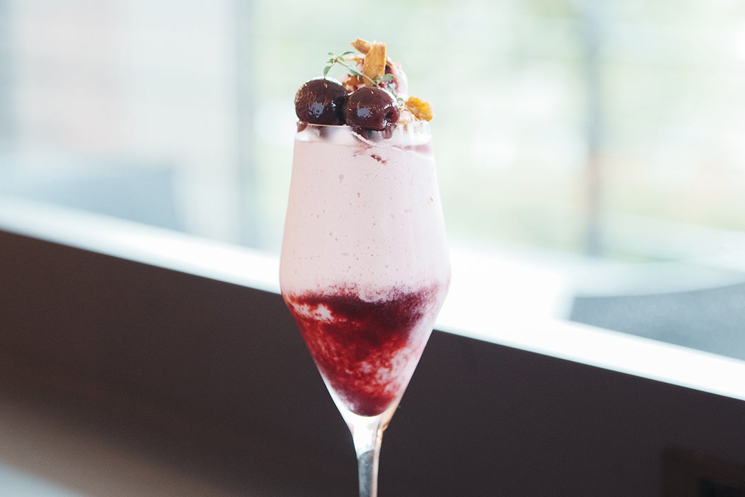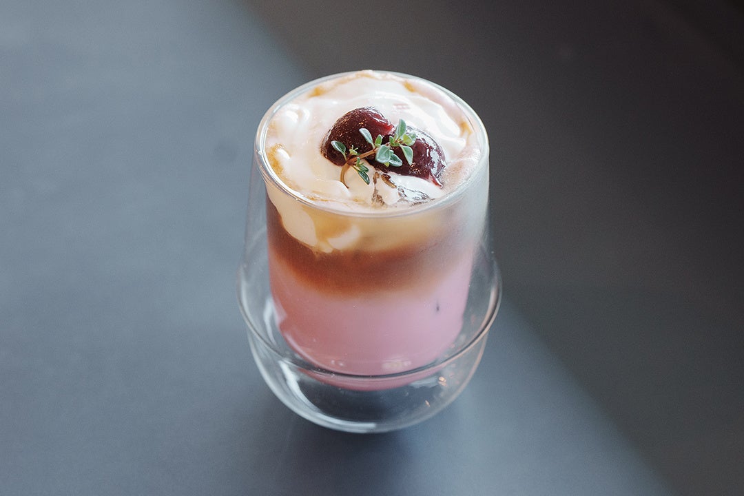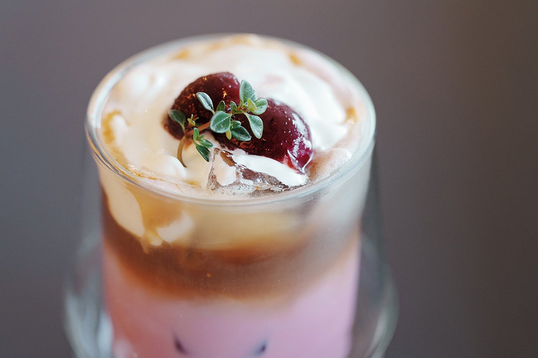 ダークチェリーとヨーグルトのコントラストが美しい一杯です。シェイクとピューレ、トッピングのチェリーを混ぜながらお楽しみください。