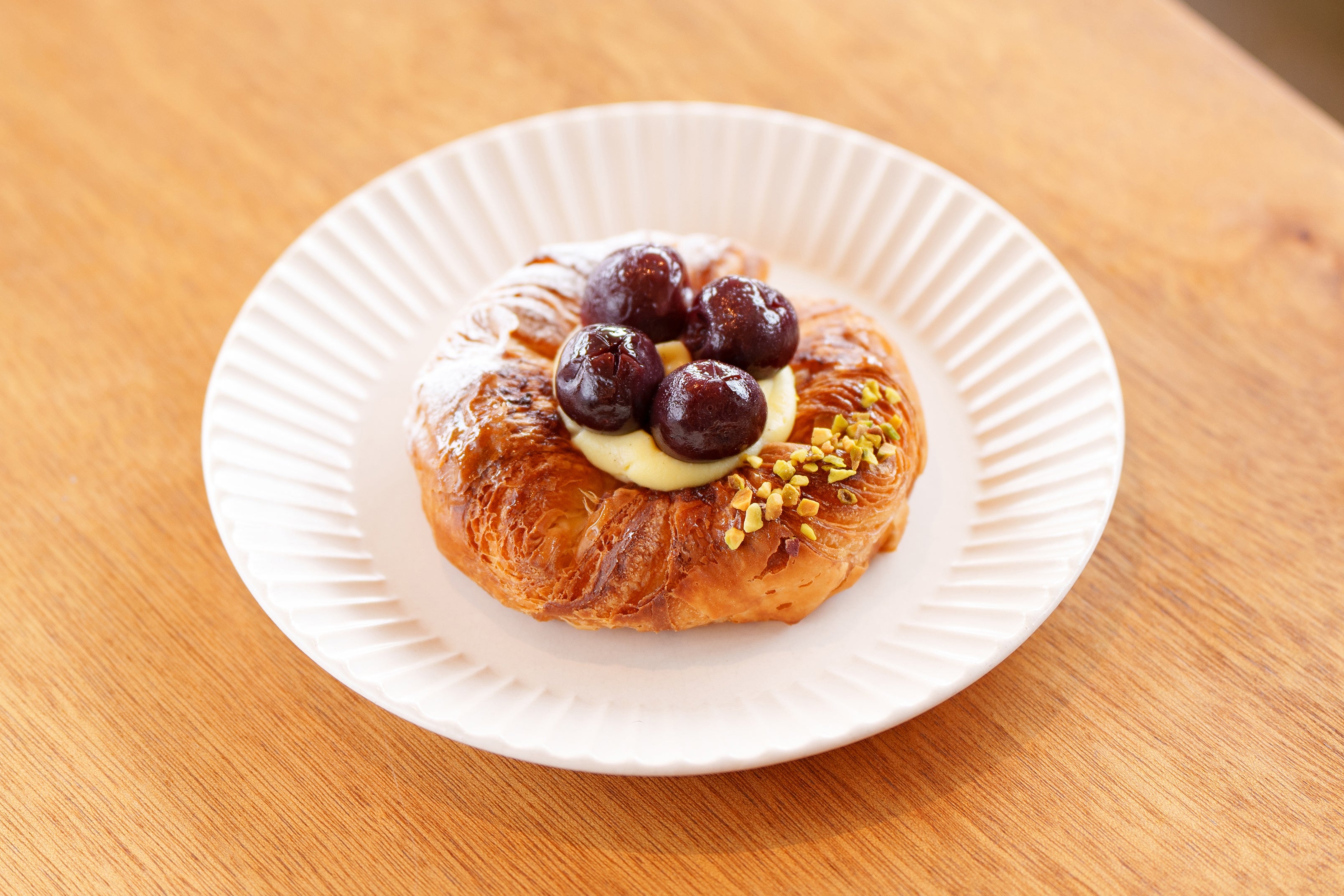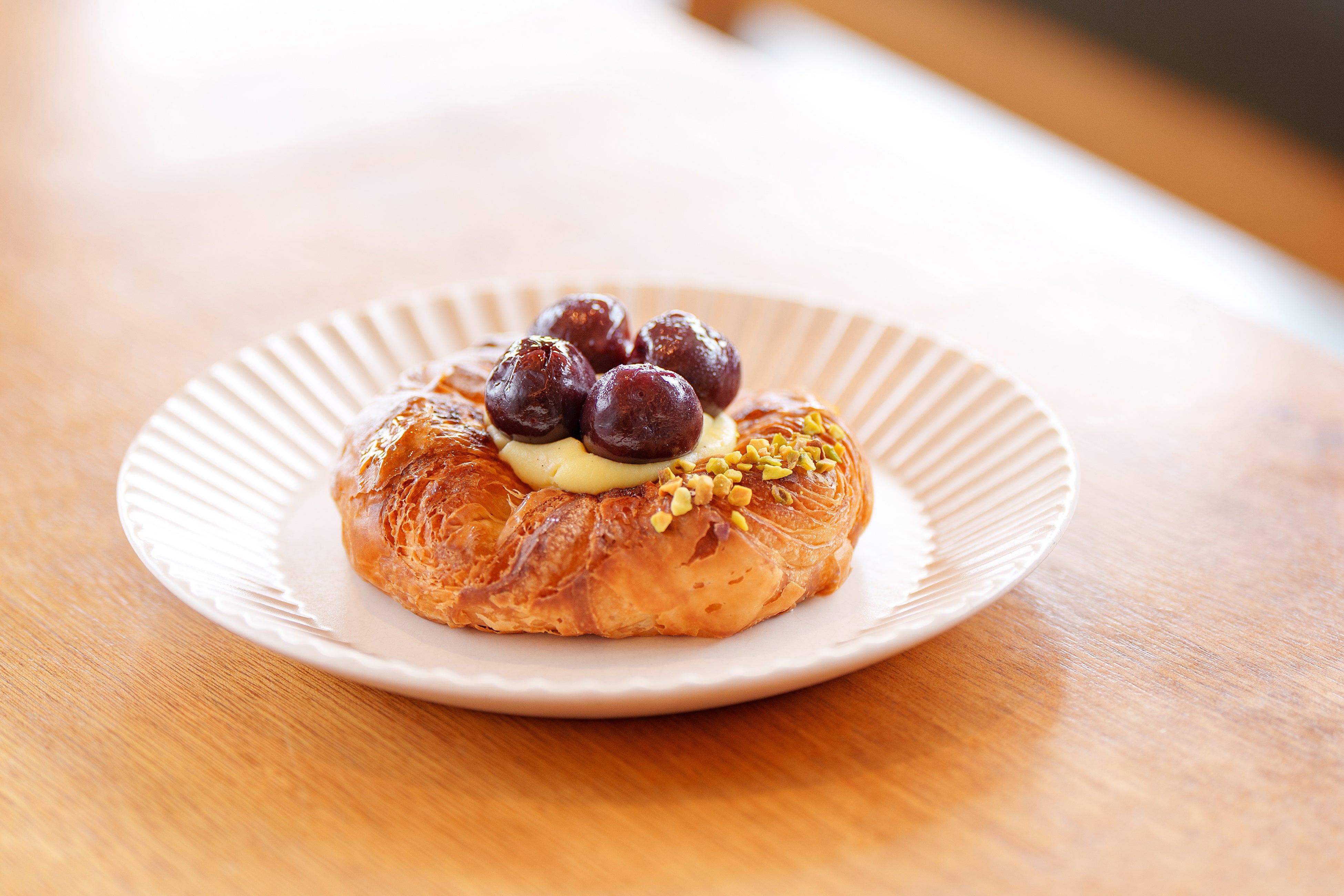 デニッシュやパイのサクサク生地と甘酸っぱい自家製チェリーコンポートを組み合わせたパンをご用意しております。