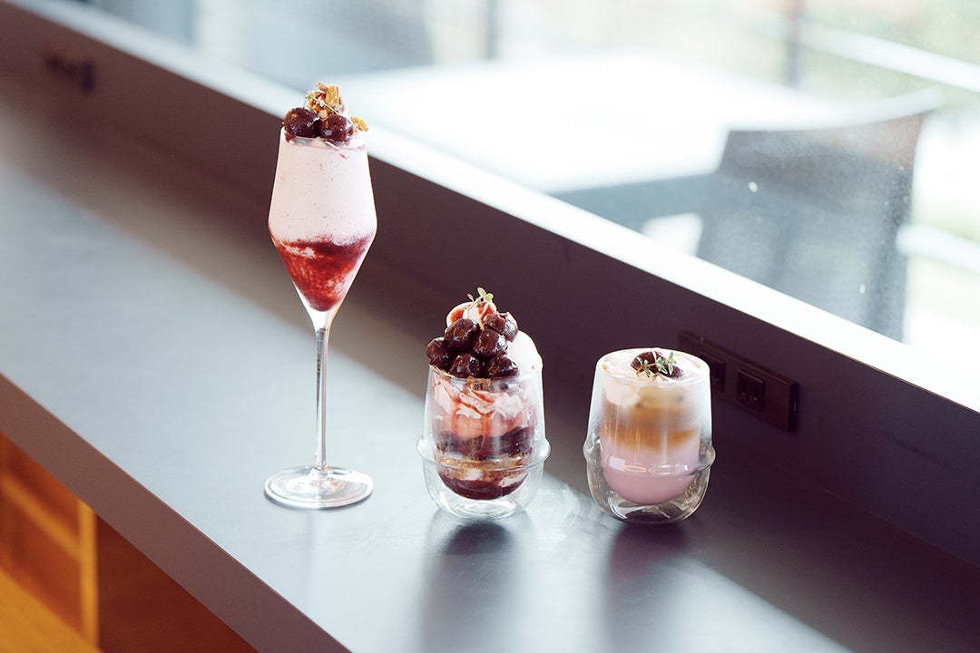 どちらも色鮮やかなダークチェリーとヨーグルトを組み合わせ、「ダークチェリーパフェ」は併設のSTONG bakeryのパイ生地やチェリーシャーベットなどを重ねてダークチェリーをふんだんにトッピング、「ダークチェリー&ヨーグルトシェイク」はなめらかにシェイクしさっぱり飲みやすく仕上げています。