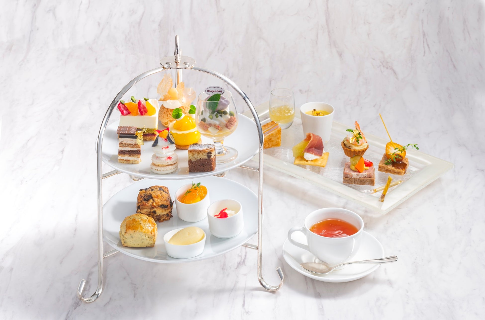 ハーゲンダッツを使ったアフタヌーンティーが開催されます。桃やパイナップル、マンゴー、ラズベリーといった夏のフルーツを使ったスイーツとハーゲンダッツの期間限定フレーバーを使った特別なミニパフェをセットにし、セイボリーとともにお楽しみいただけます。